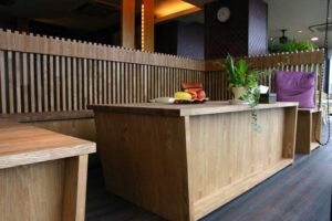こちらはロビーに置くベンチシート。みんなが集まって飲む場所がない!なんか作ってくれ!ということで8人ぐらいがぐるっと囲んで飲める場所をつくりました。