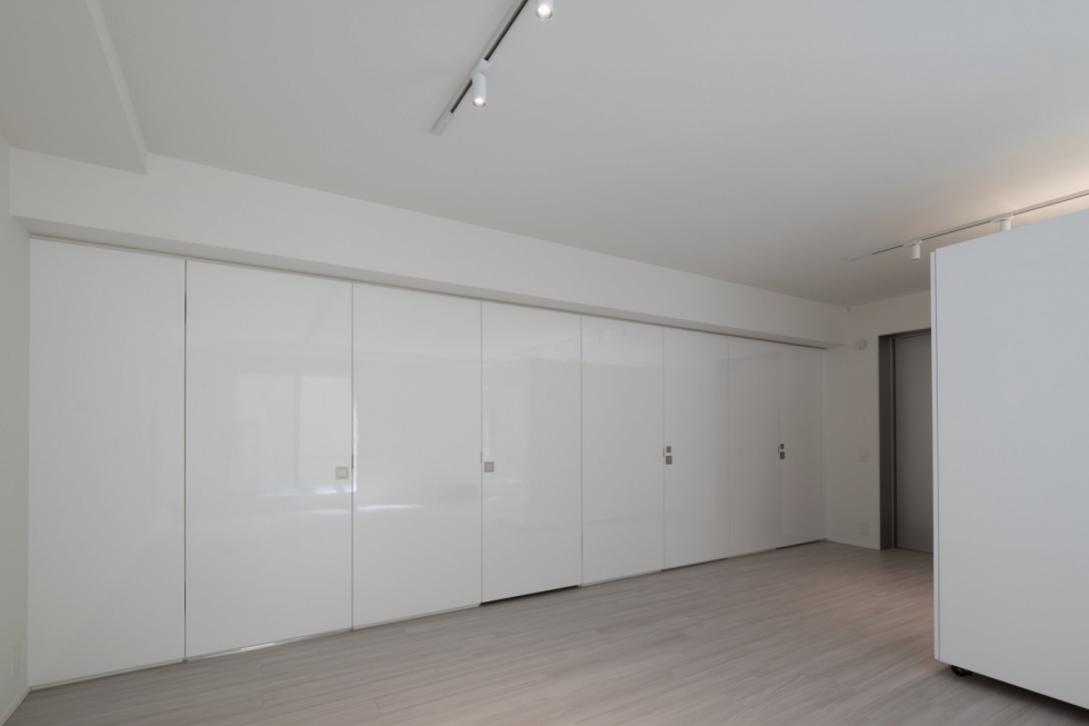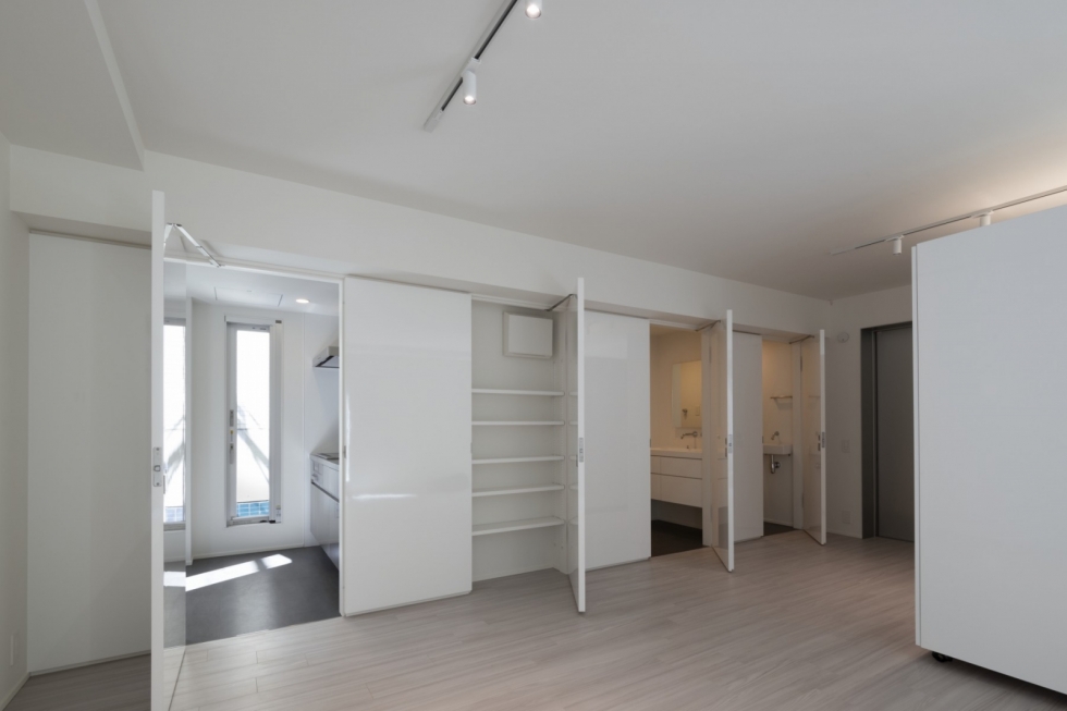 写真は1室の壁面。大きなワンルームの扉の向こうに様々な機能が均質に隠されてます。リビングにトイレの扉が面するとちょっとやだなって思うけどこうして均質に並べられると違和感なしですね。