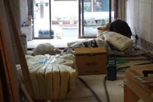 モッフモフの断熱材を床に敷き詰めてもらってます。