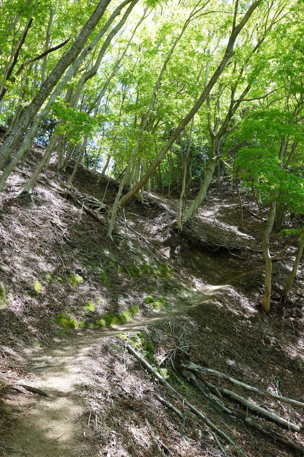 青空、枯れ木の大木、わかばの緑。枯れ葉と落ち枝でビッシリと覆われた地表面。このコントラストを森下に。