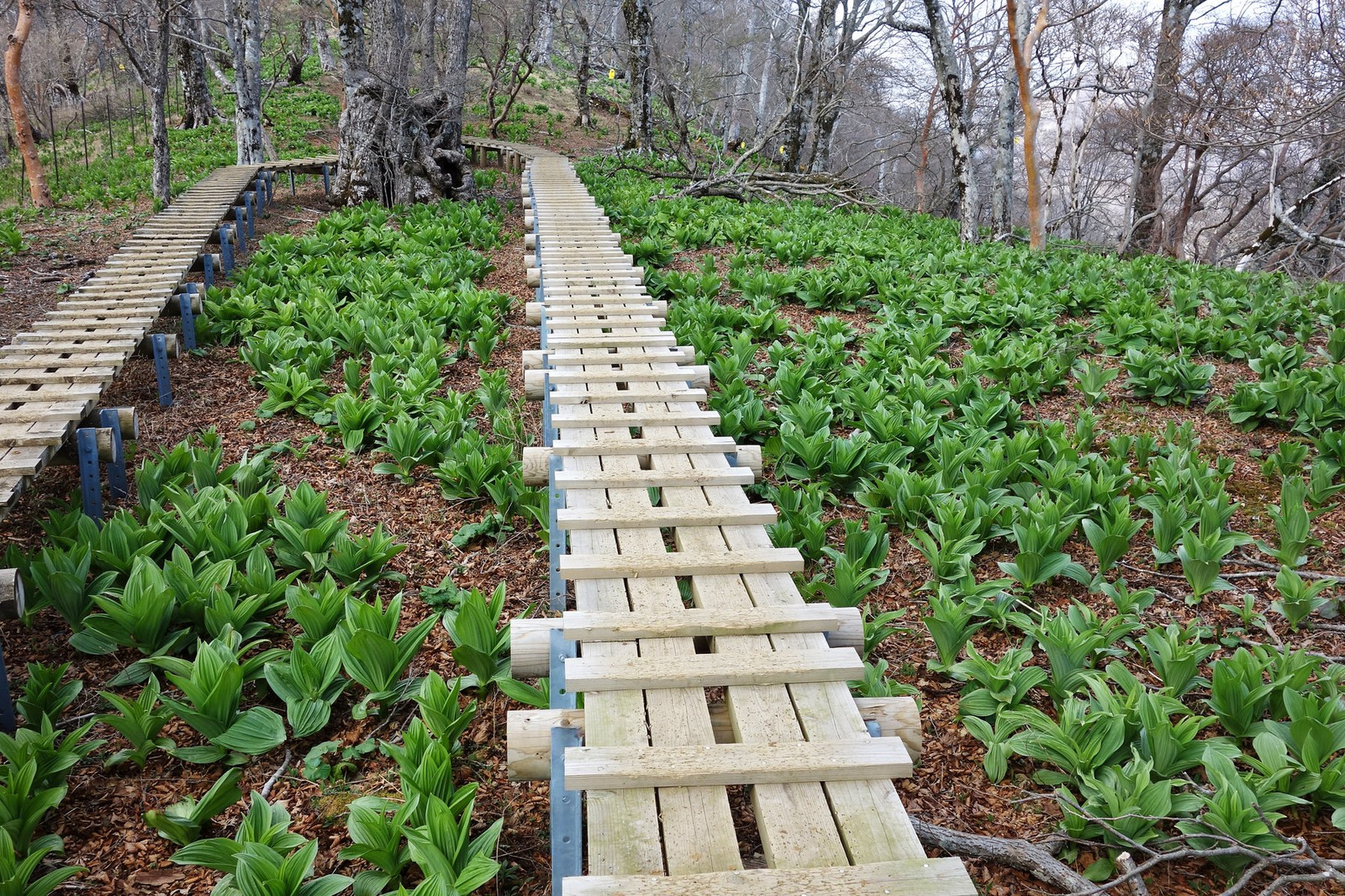 バイケイソウの若葉が落葉の隙間を狙ってキラキラと緑にきらめく姿といったらカワイイのなんの。
