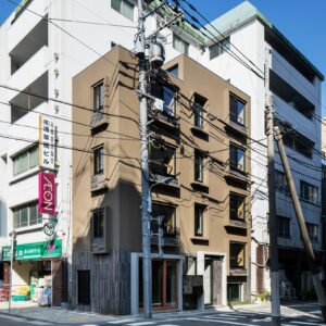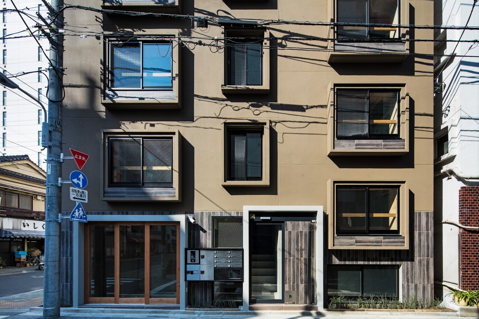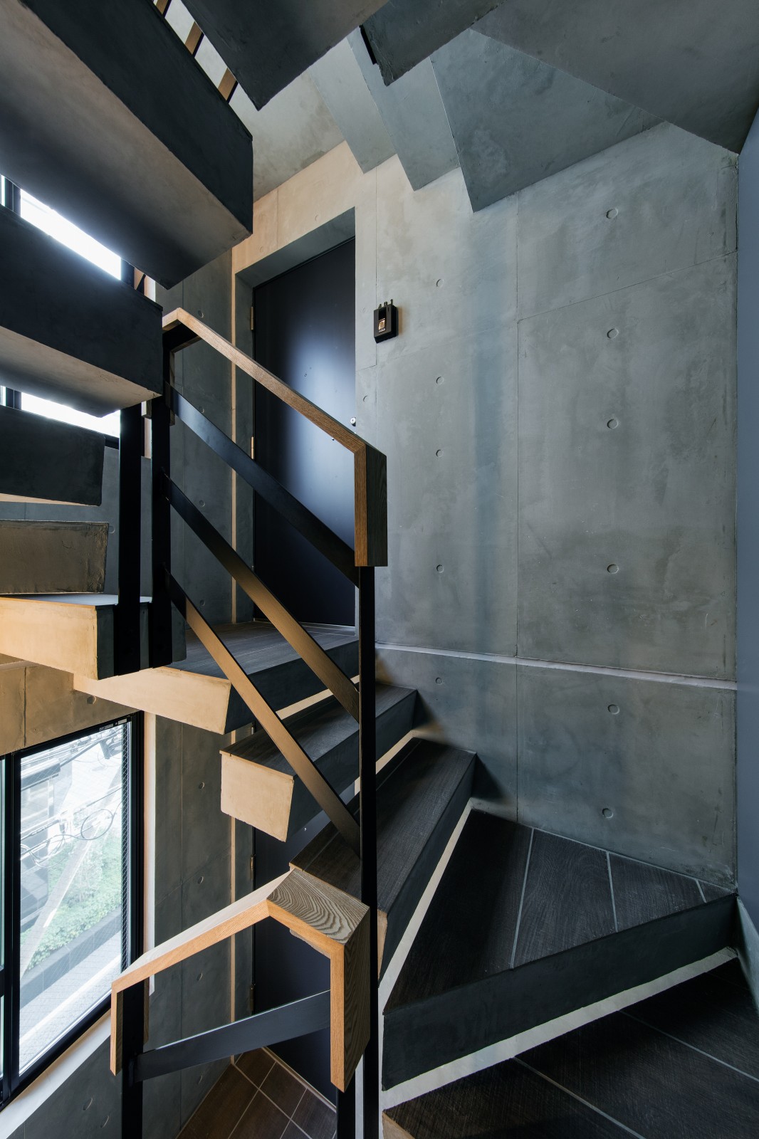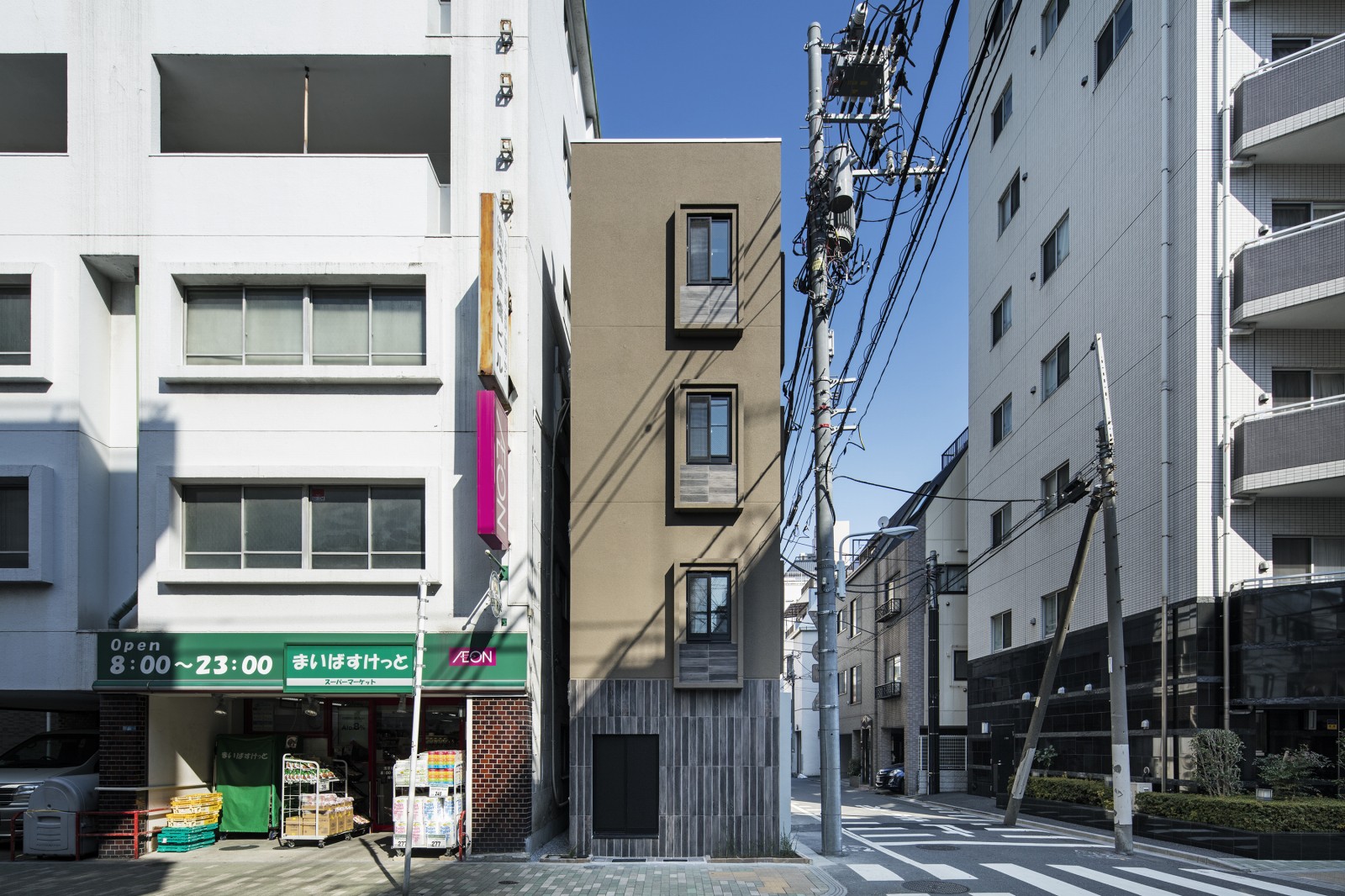 JR浅草橋駅から徒歩4分に建つ小さな集合住宅。12坪の土地の収益性を最大限確保できるよう4階建てと半地下+4階建てを半層ずらし、共用階段でつなぎました。半層ずれることで各フロアが踊り場から入るような感覚となり、各部屋の独立性を高めるとともに4階まで階段で登る疲労感を軽減されています。