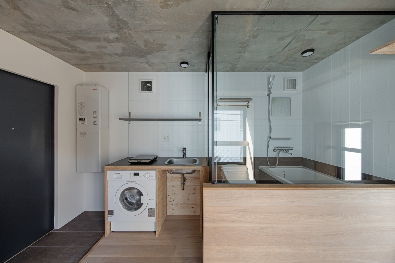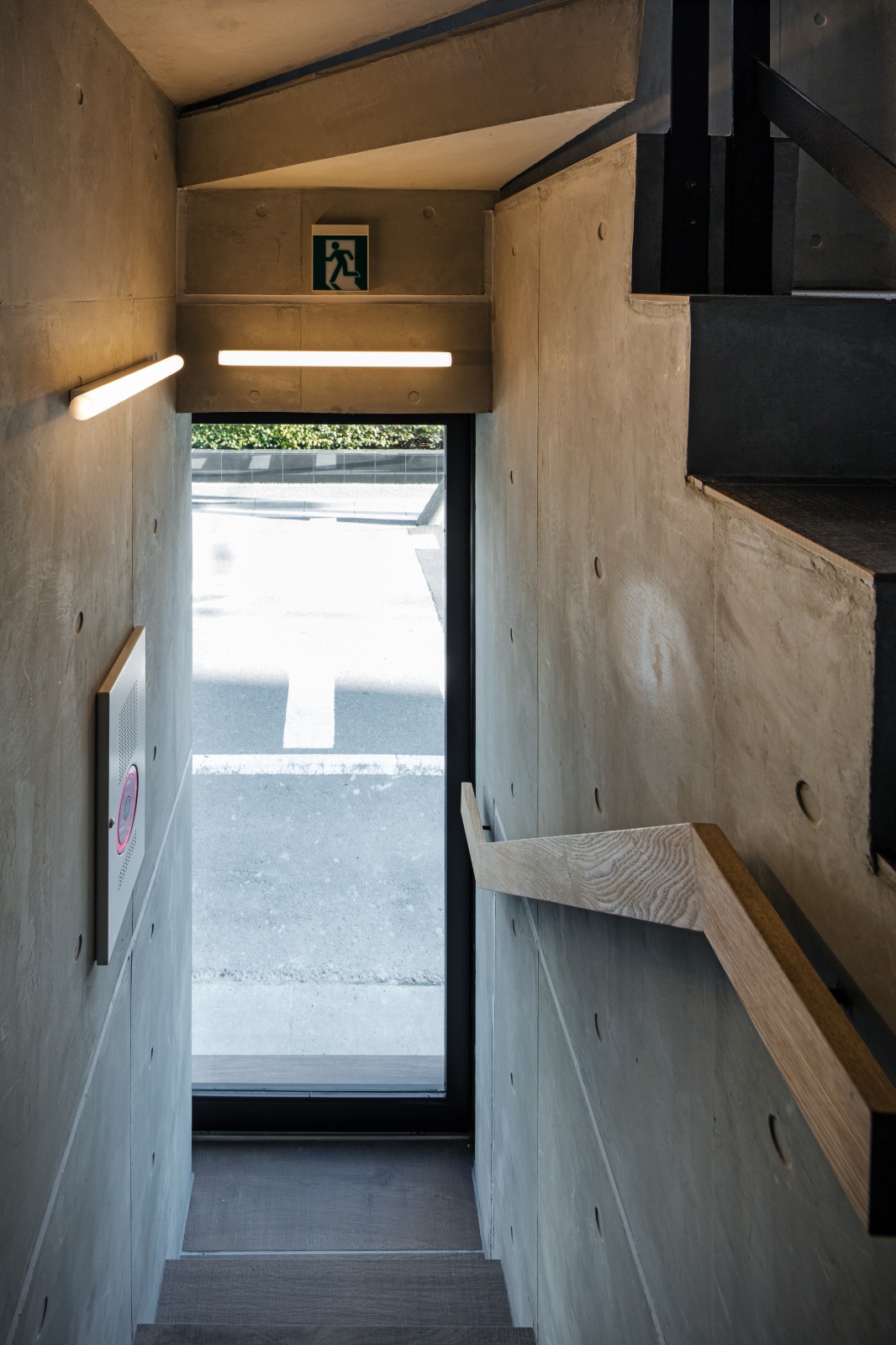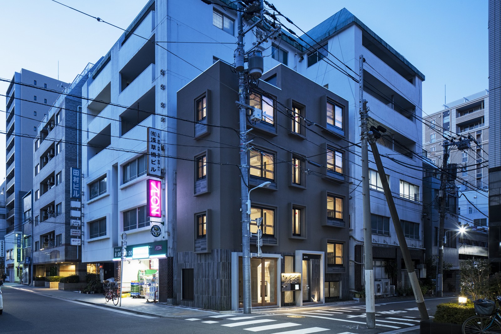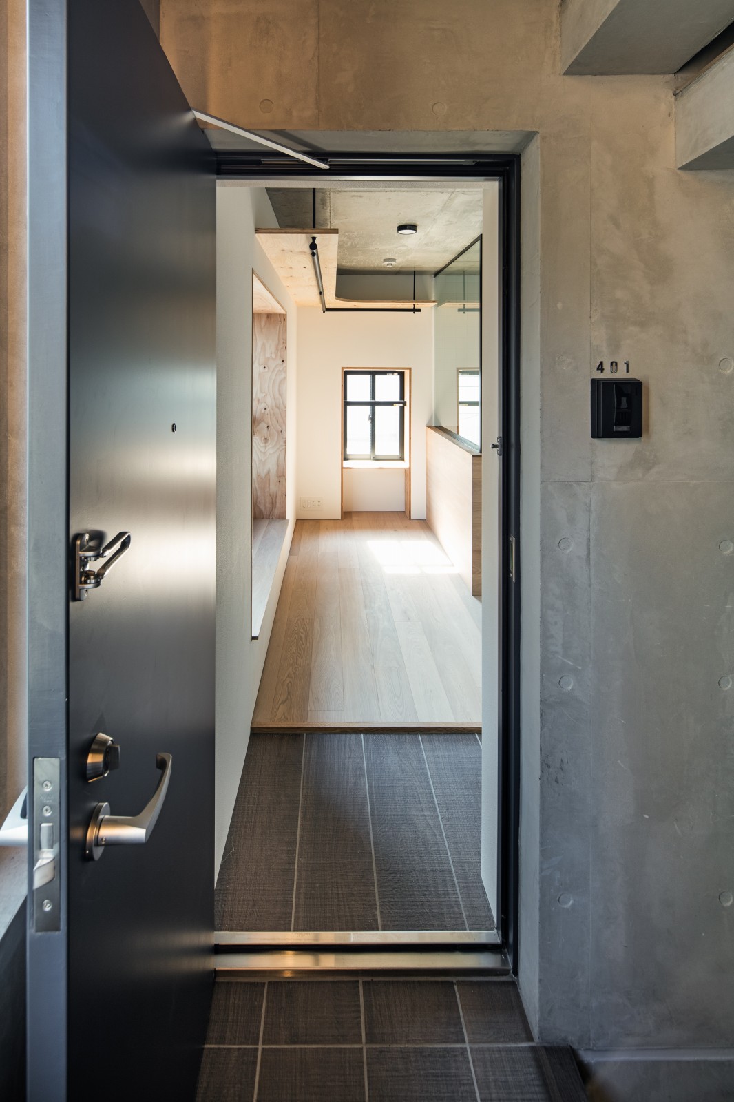 JR浅草橋駅から徒歩4分に建つ小さな集合住宅。12坪の土地の収益性を最大限確保できるよう4階建てと半地下+4階建てを半層ずらし、共用階段でつなぎました。半層ずれることで各フロアが踊り場から入るような感覚となり、各部屋の独立性を高めるとともに4階まで階段で登る疲労感を軽減されています。