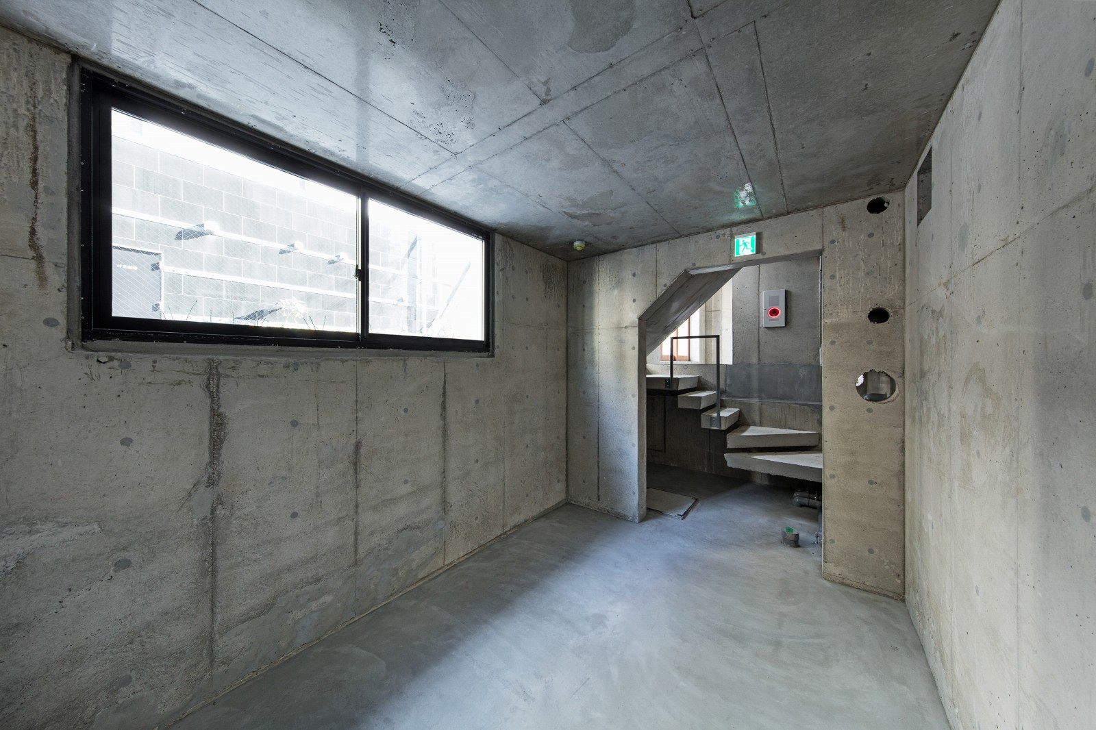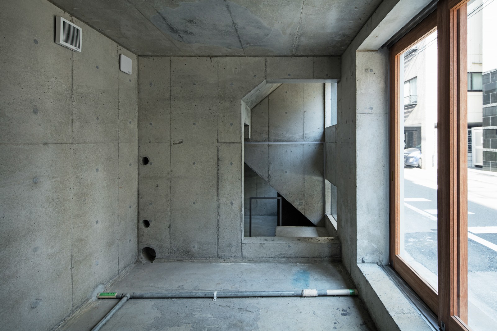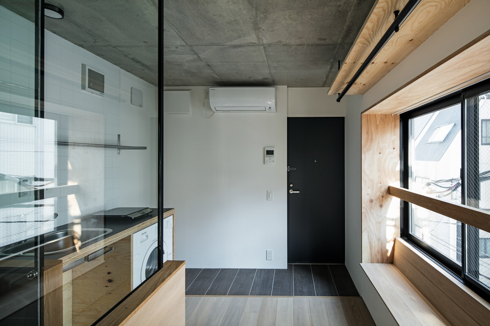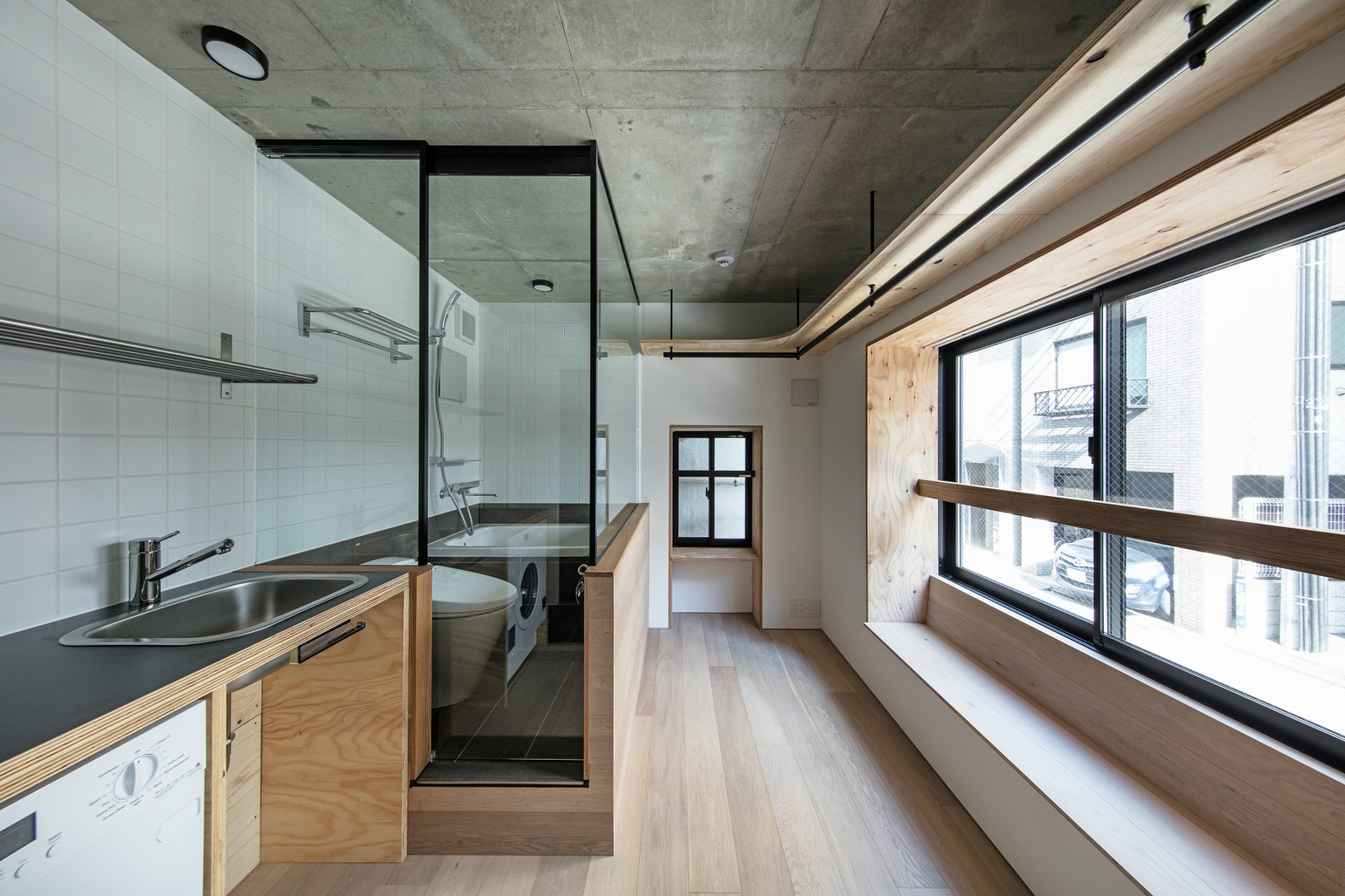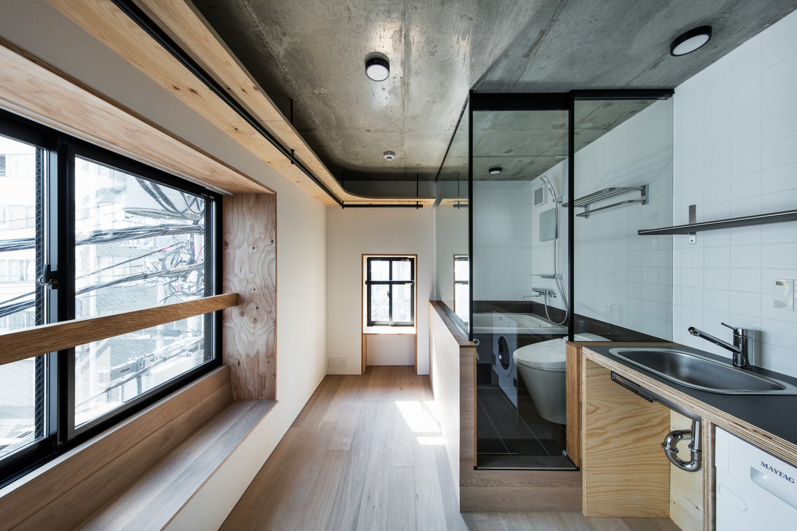 1階は場所性を考慮し、地上階と半地下を繋いだスケルトンの貸店舗。必然的に住居は2階もしくは1.5階から始まり通りから距離をおいています。集合住宅はわずか11.5m2のワンルームが半層ずらしながら7部屋積み上げられています。部屋の大きさを最大限体感できるよう、水回りなど閉じた場所をなくすとともに、座れる出窓を設けました。出窓を座れるようにすることで街に対して縁側のような場所が生まれ、小ささを積極的に生活へ還元できないかと考えました。