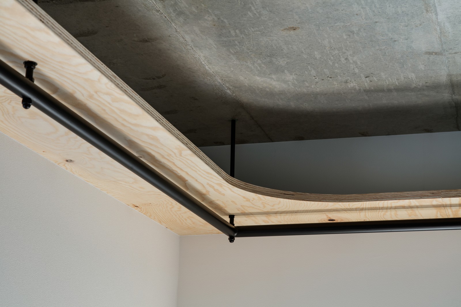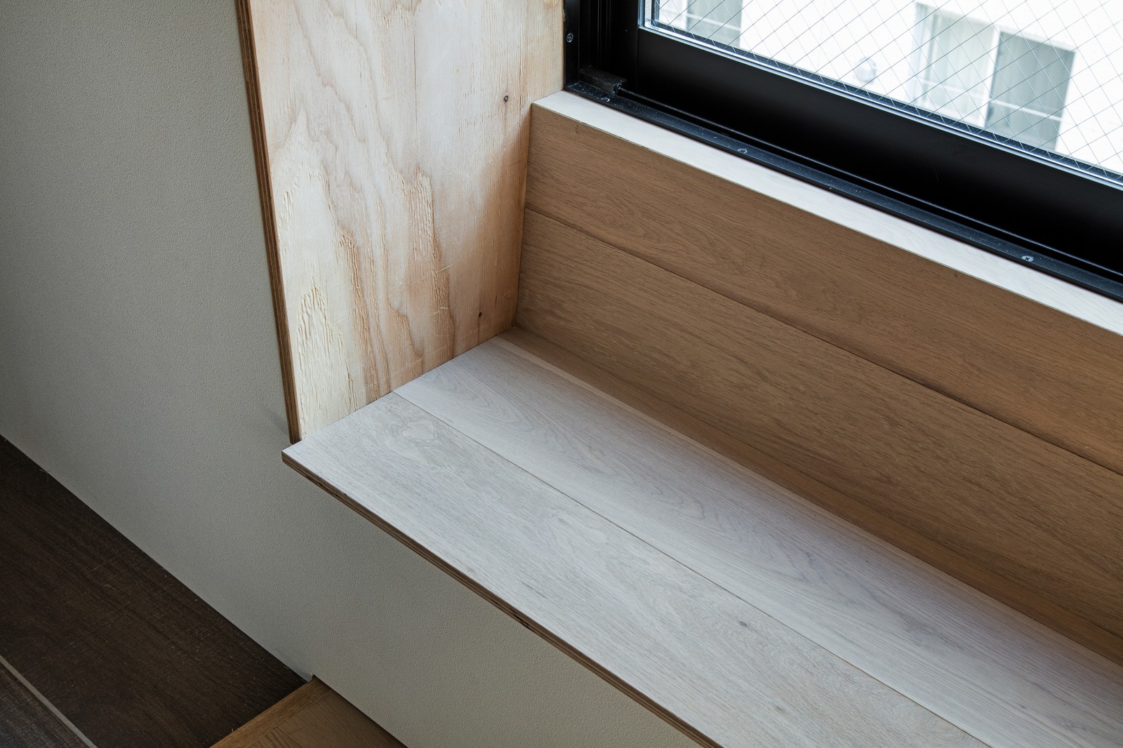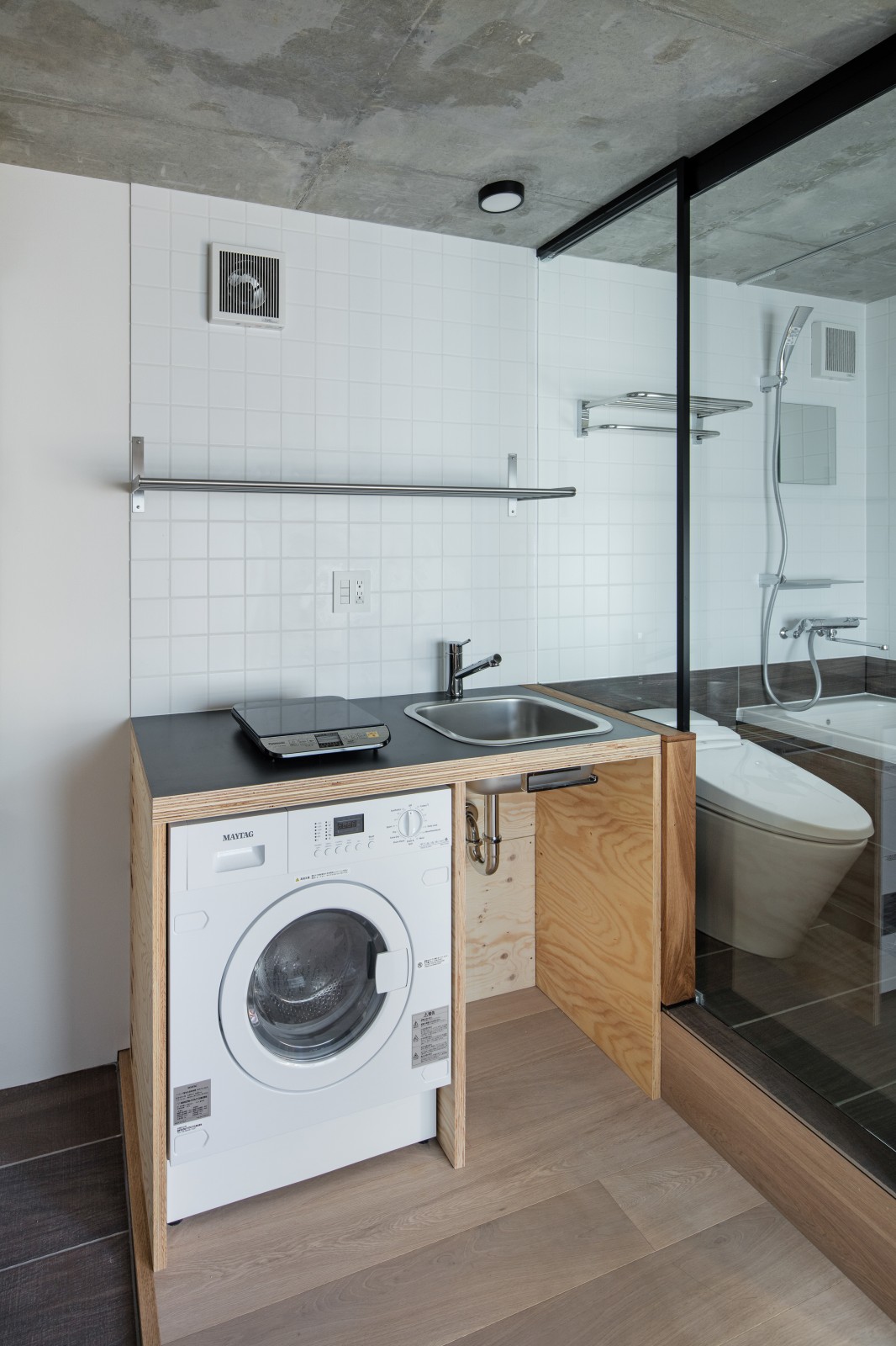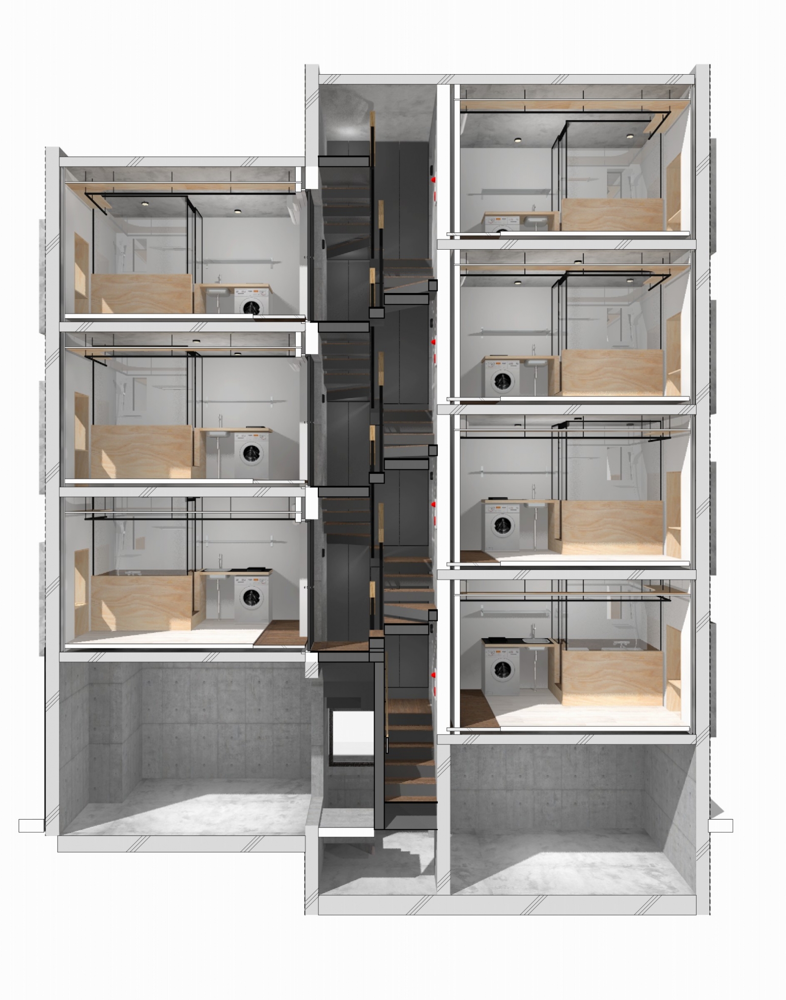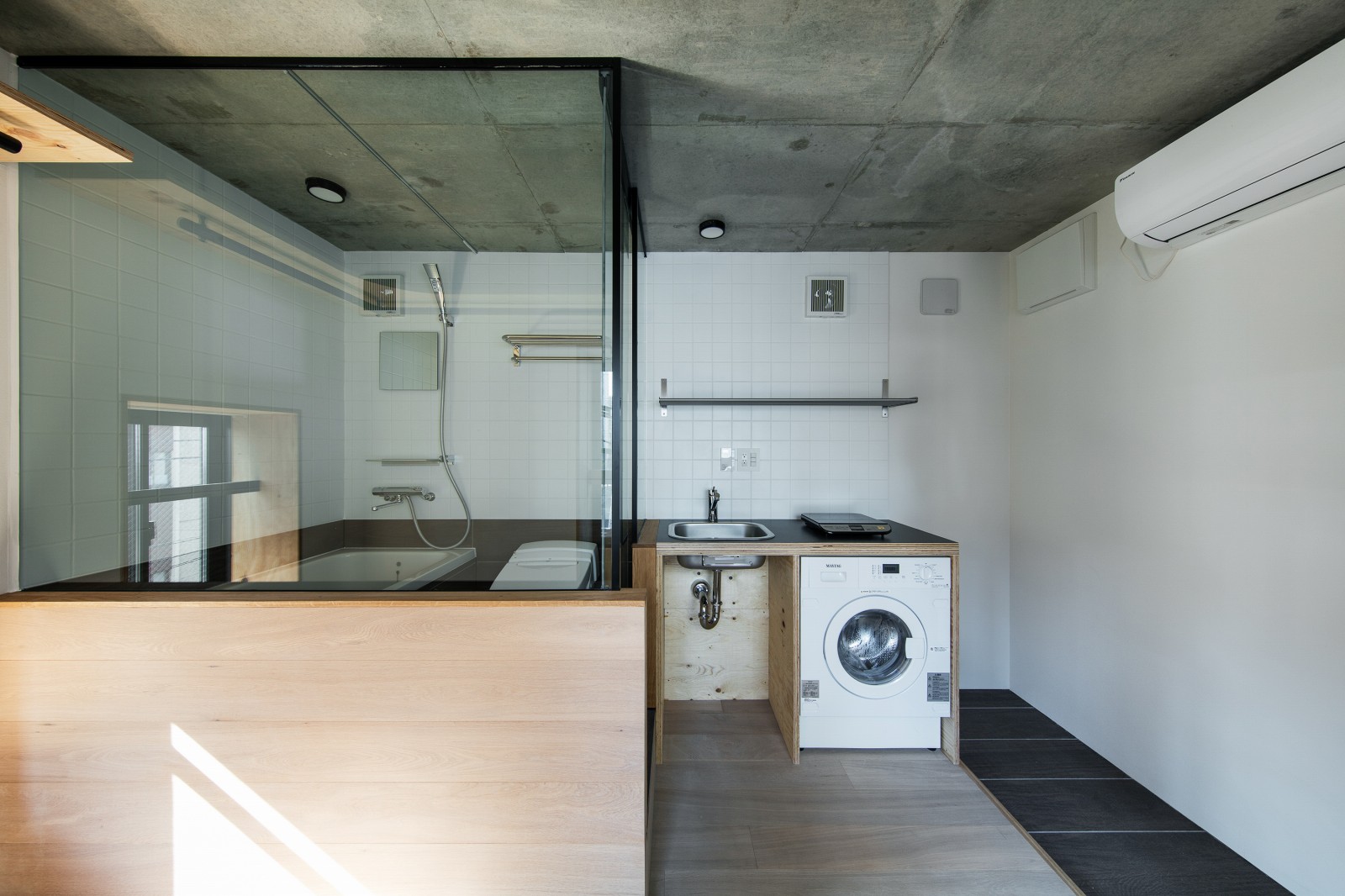1階は場所性を考慮し、地上階と半地下を繋いだスケルトンの貸店舗。必然的に住居は2階もしくは1.5階から始まり通りから距離をおいています。集合住宅はわずか11.5m2のワンルームが半層ずらしながら7部屋積み上げられています。部屋の大きさを最大限体感できるよう、水回りなど閉じた場所をなくすとともに、座れる出窓を設けました。出窓を座れるようにすることで街に対して縁側のような場所が生まれ、小ささを積極的に生活へ還元できないかと考えました。