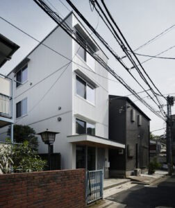 住宅密集地かつ細い路地のような道路に面した敷地に建つ木造3階建住宅。
