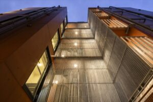 中庭を見上げる。動線に合わせてルーバーが斜めに振られているため視線が相対しない
