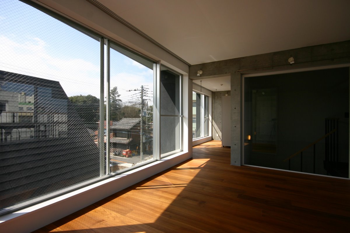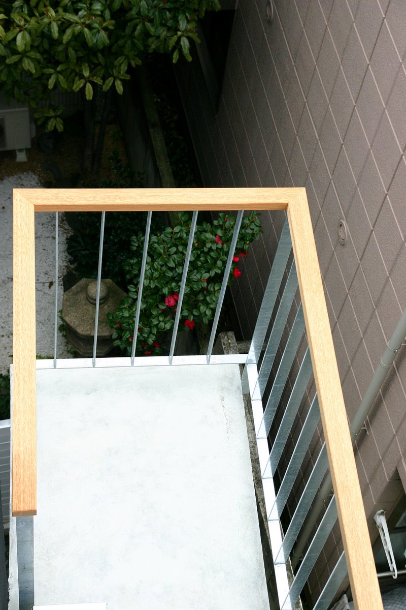 4階北側バルコニー。手摺はラワン材にオイル塗装。