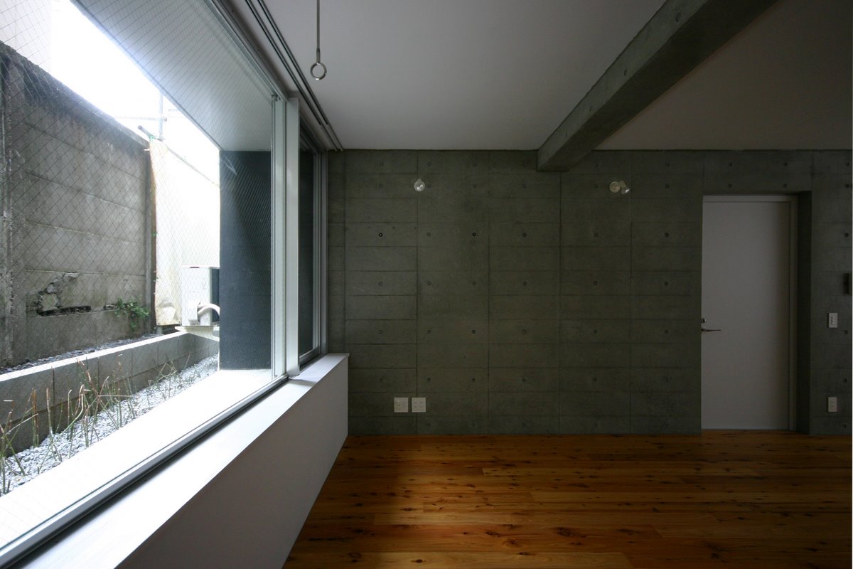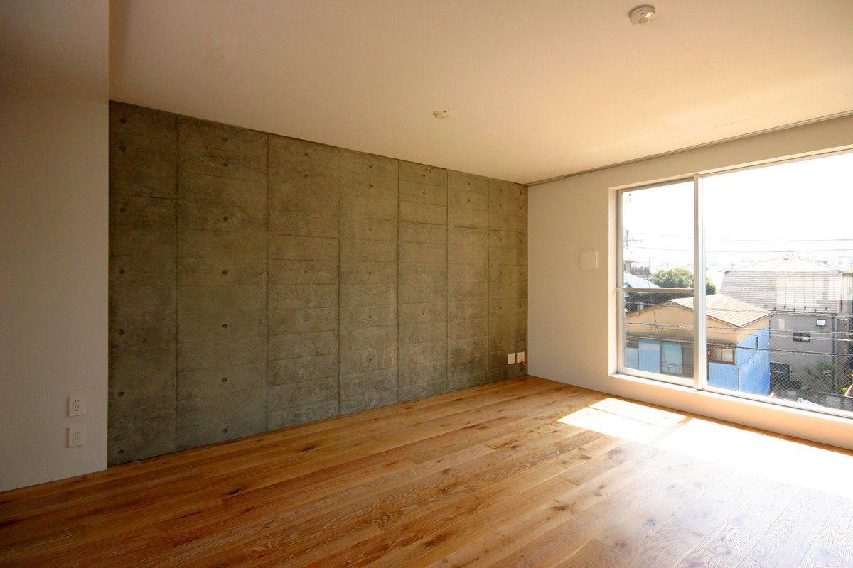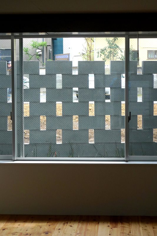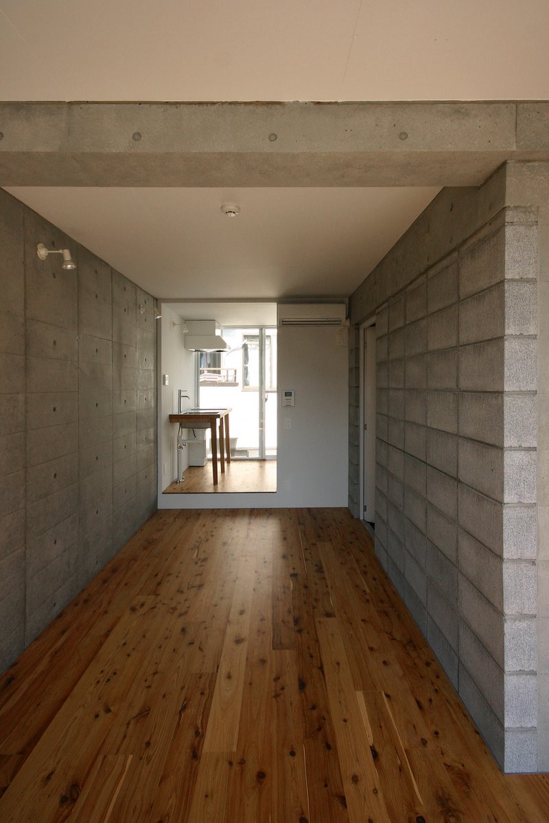 2階の小さいタイプの居室(203号室)。階段室側はコンクリートブロック素地。ブロック目地に合わせて躯体にも目地が入れられている。