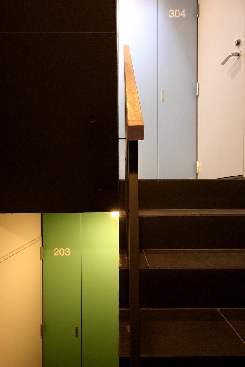 階段室。無機質なPS扉はカラフルに塗装。緑と空。