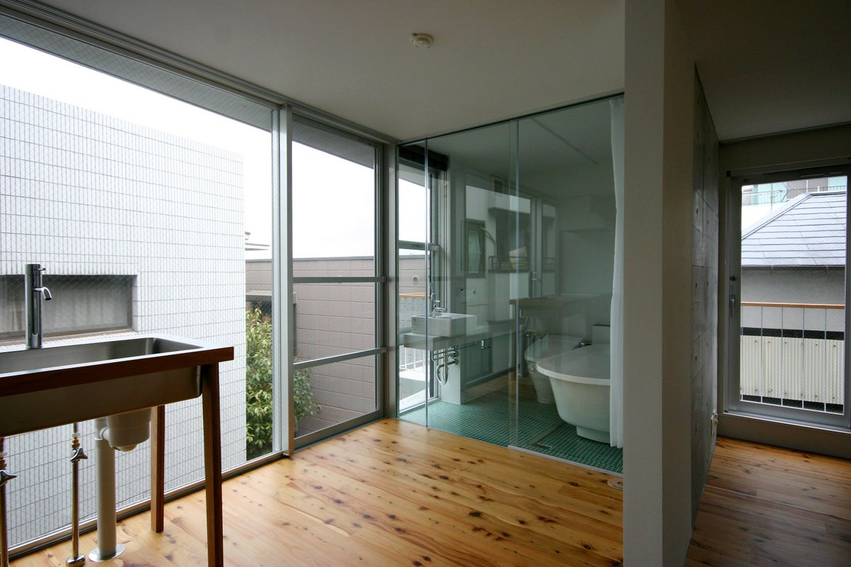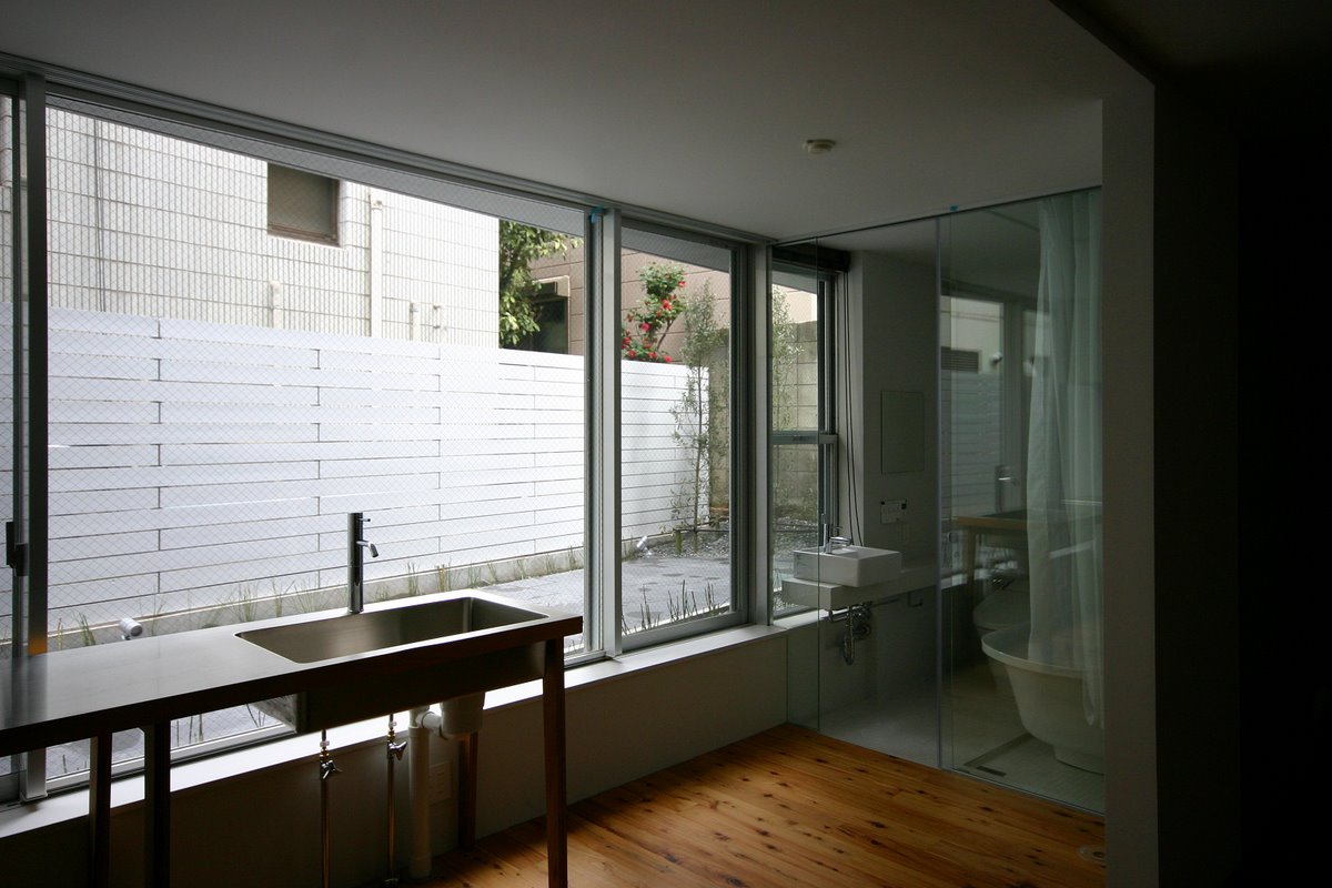 1階キッチンと浴室(104号室)。周辺建物の色に合わせた白い塀と白いタイル。
