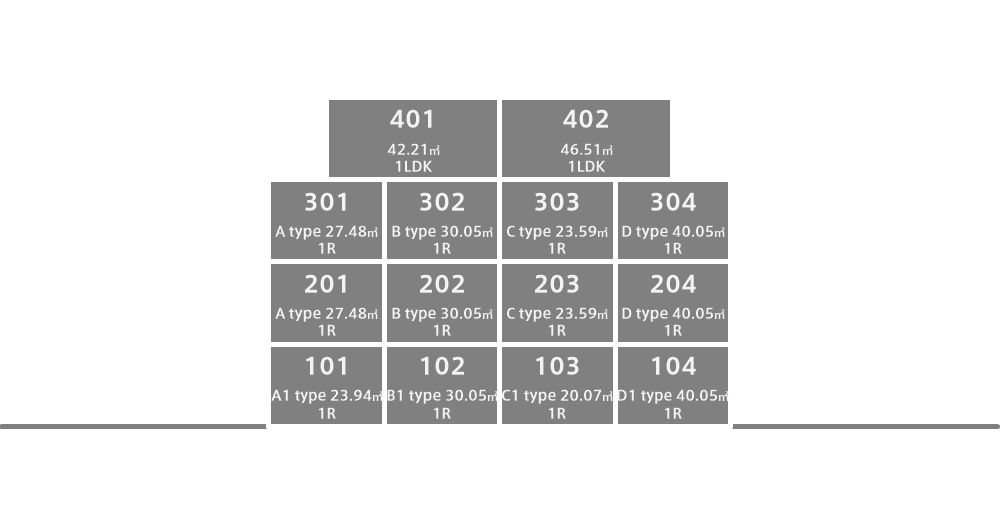 4階居室(402号室)。階段室を挟んだワンルーム。