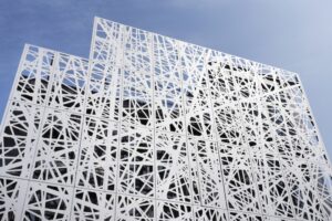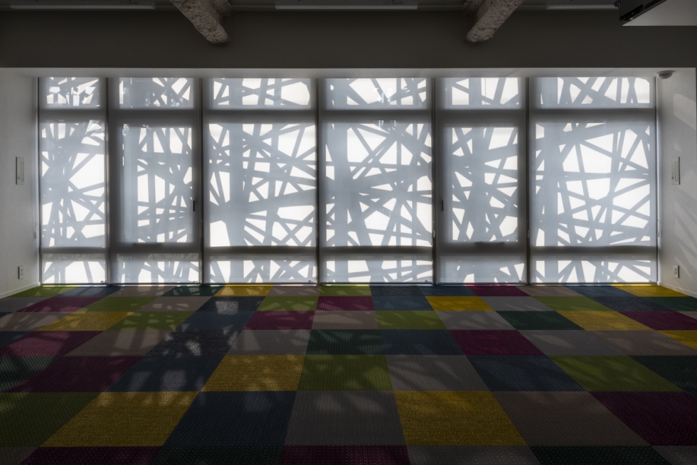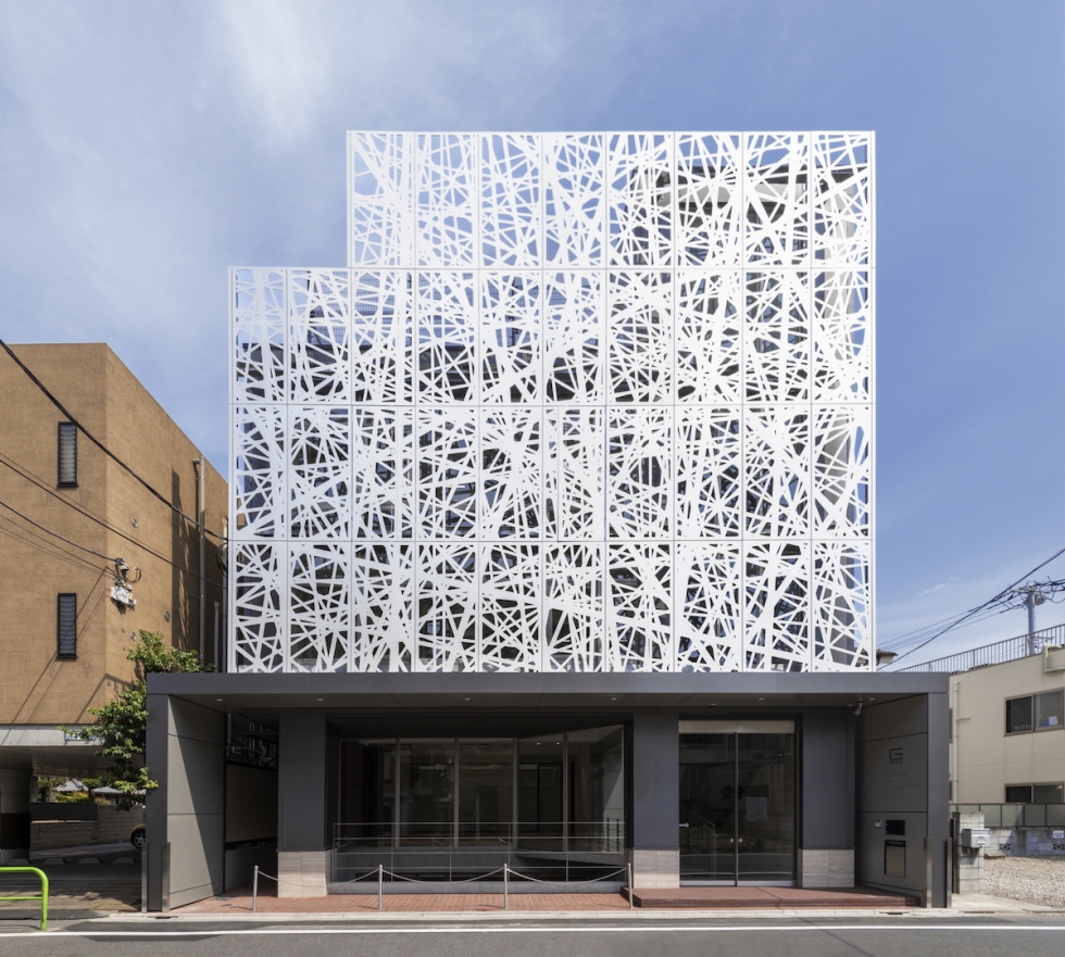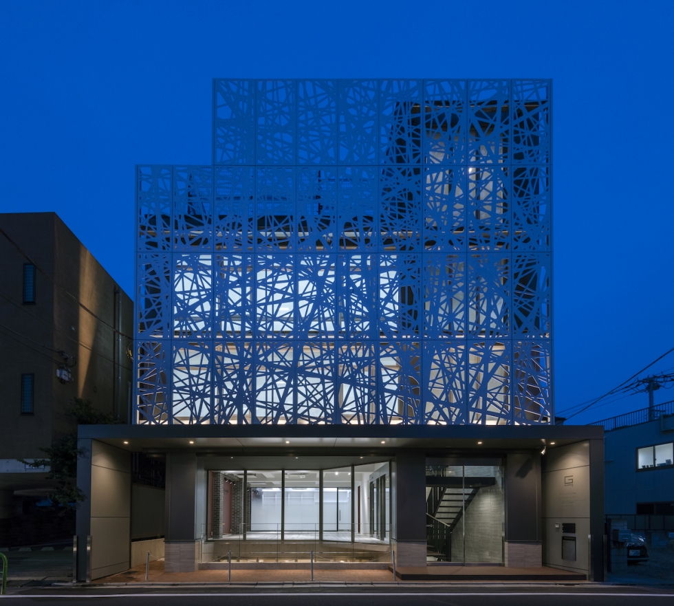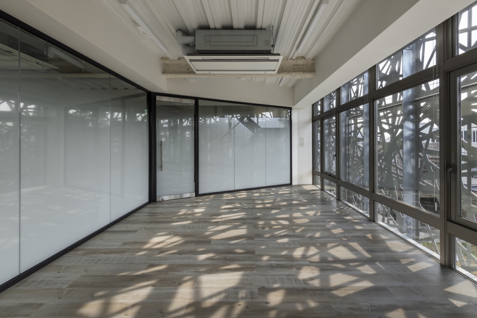 西側道路に面する敷地のため西日を軽減させつつ特徴のある外観とすること、内部はフレキシブルに使えるよう可能な限り広いワンルームが4フロア求められました。西日対策としてランダムに枝を編み込んだようなアルミパネルをルーバーとして用い、森を下から見上げてるような表情としました。夕方になると木漏れ日のように西日が差し込み、都市の中にいても自然の時間の流れを感じられるオフィスビルです。