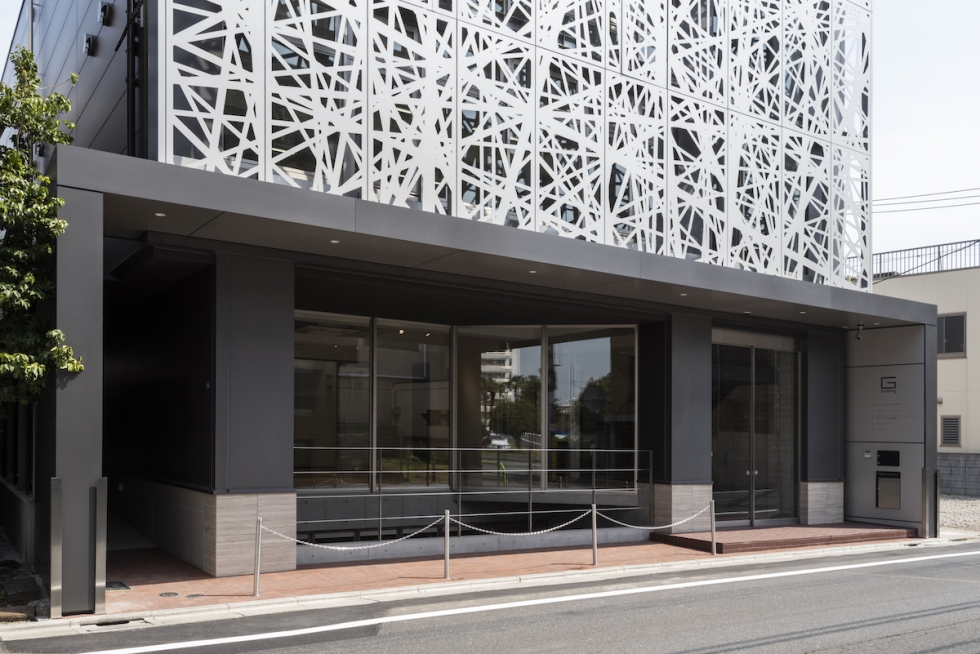 1階エントランス。来客や従業員の方々が雨でも快適に建物に入れるよう大きなゲートを設けた。左側は建物裏の駐輪スペース入り口