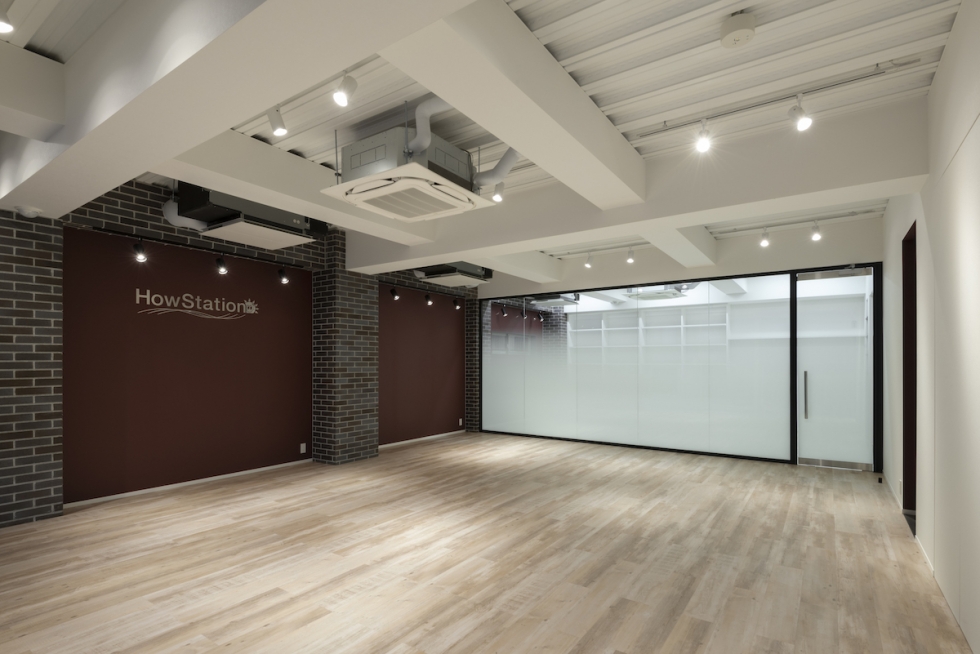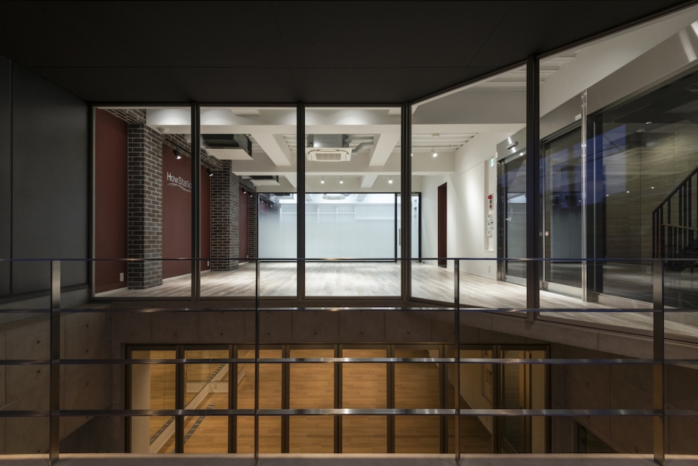 地階オフィス1。多目的スペース的に使えるよう鏡張りや大きなキッチンが設けられている。