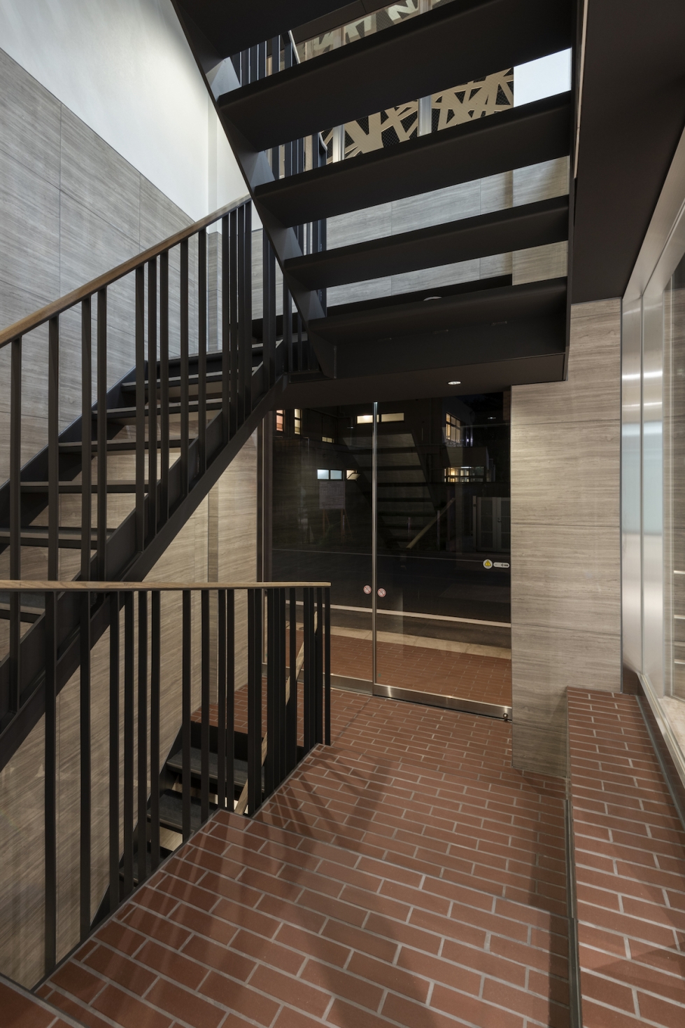 階段室。車椅子の方も補助があれば上がれるよう1段の奥行きを広く確保。その先にエレベーター。