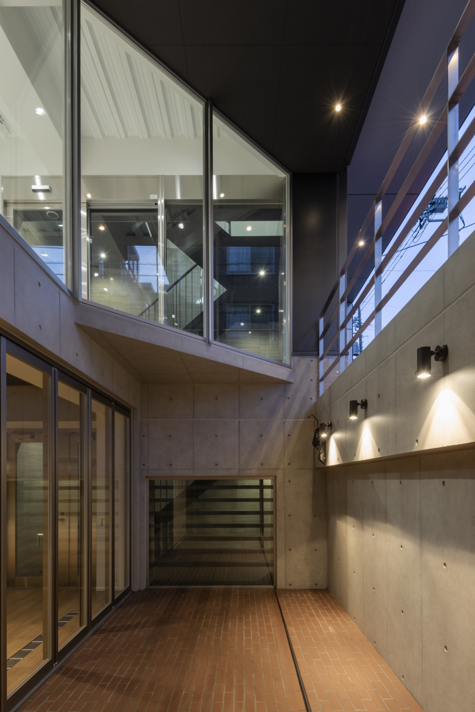 1階はGLから70cm持ち上げられておりドライエリアを介して道路と地下、道路と1階の距離をつくった
