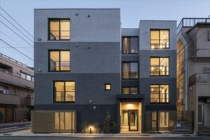 |用途:共同住宅(19戸)|計画地:東京都練板橋区大山町|敷地面積:169.91m2(51.4坪)|建築面積:127.61m2|建ぺい率:75.10% / 80.00%|施工床面積:499.55m2(151.1坪)|容積対象:425.39m2|容積率:250.36% / 254.52%|構造:WRC造|規模:地上4階建て|設計:2020年1月~2020年6月|施工:2020年6月~2021年2月