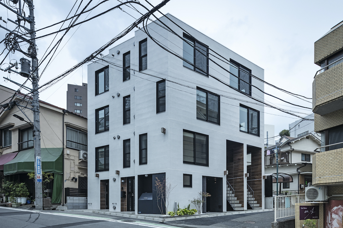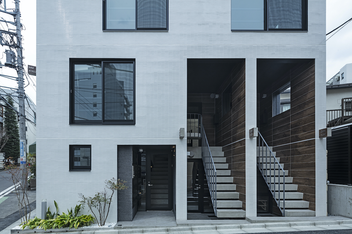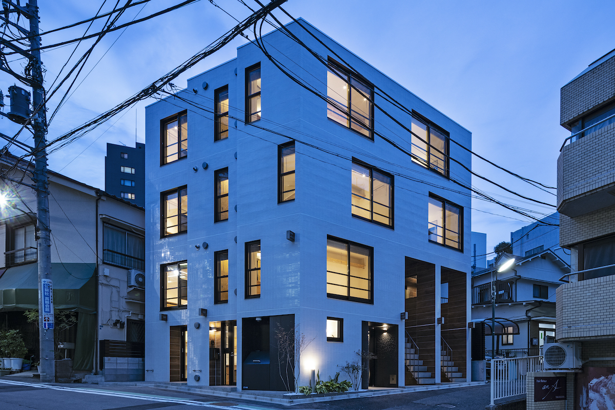 |用途 : 長屋、集合住宅 14戸(2LDKx2戸+1Rx12戸)|計画地 : 東京都港区三田|敷地面積 : 101.87m2(30.8坪)|建築面積 : 80.88m2(24.4坪)|建ぺい率:79.40%(許容:90%)|延床面積 : 320.90m2(97.1坪)|容積率:285.75%(許容:300%)|構造・規模 : RC造・地上4階建て|設計 : 2018年2月-2018年7月|施工 : 2018年8月-2019年4月|