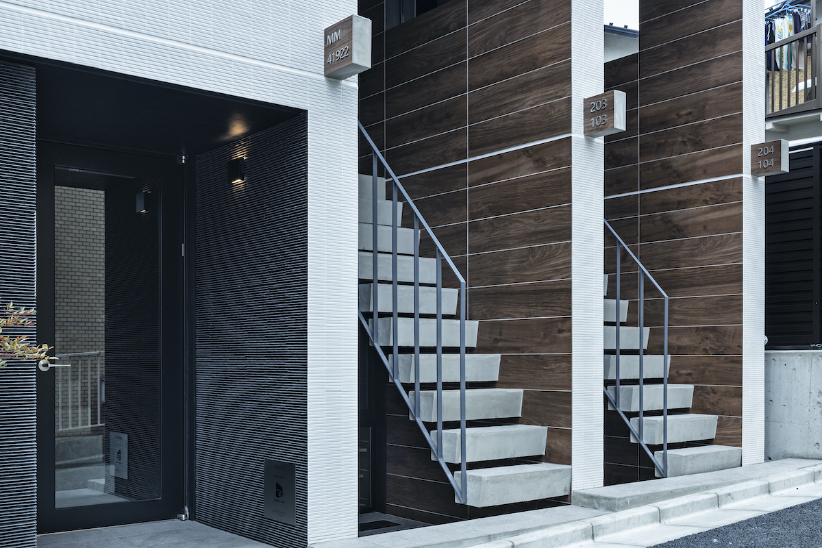 1階と2階の長屋入り口。1階は玄関内にベンチ、2階は玄関前にベンチが設けられている