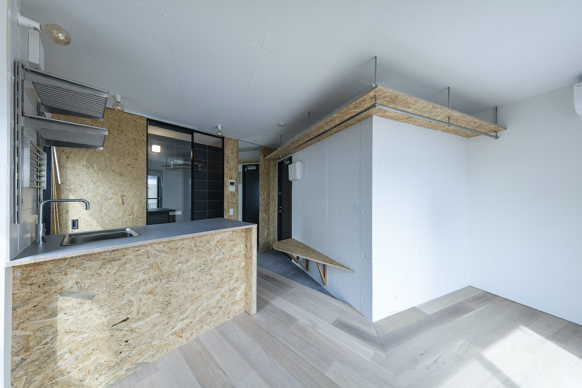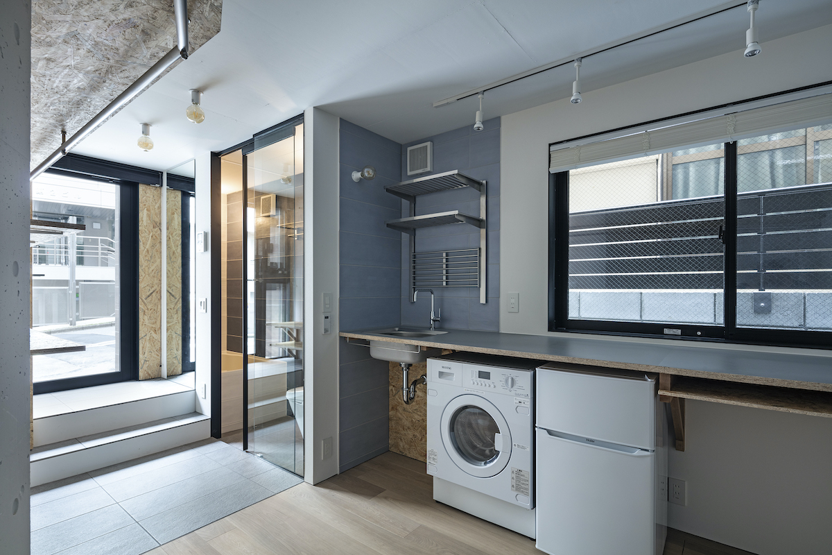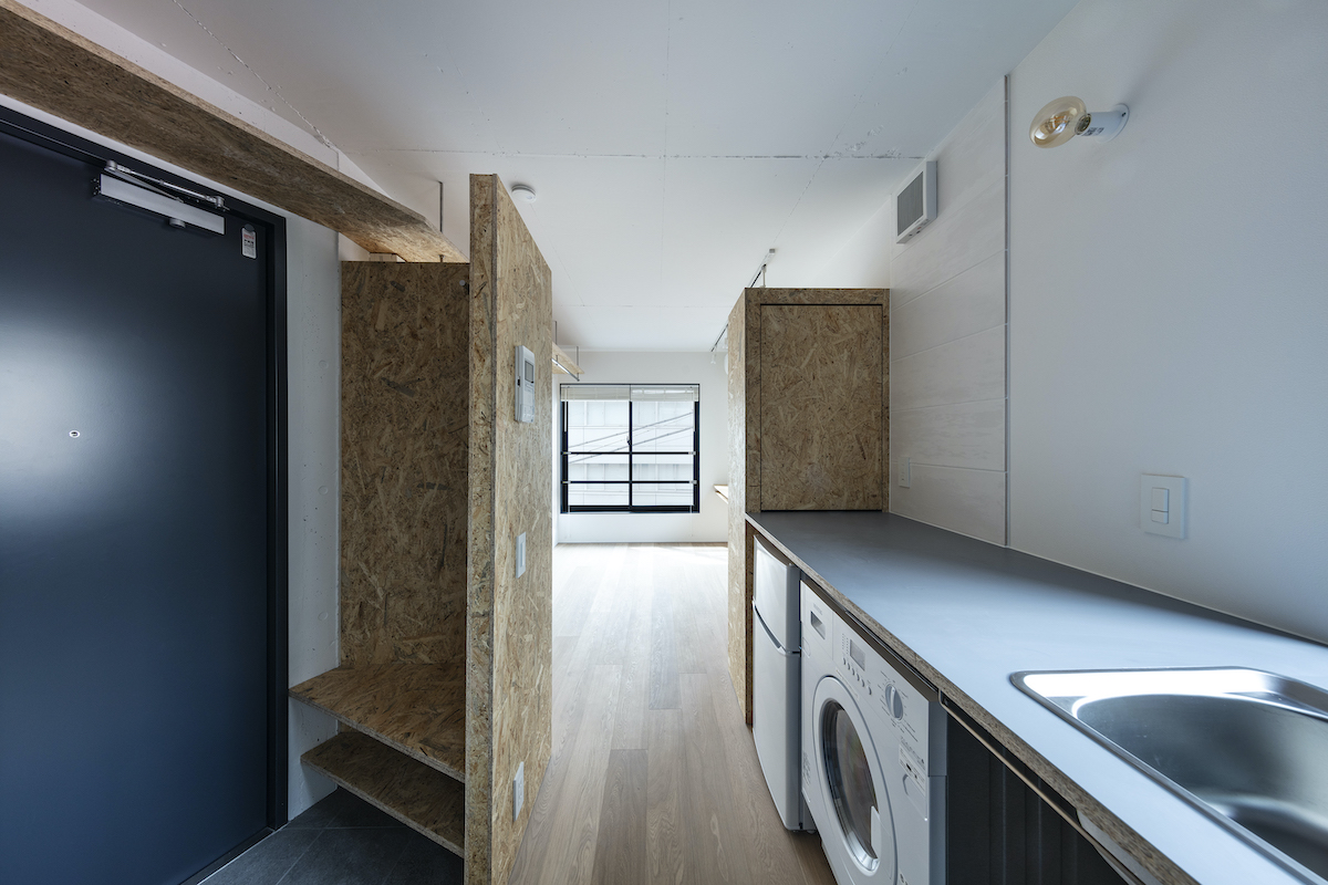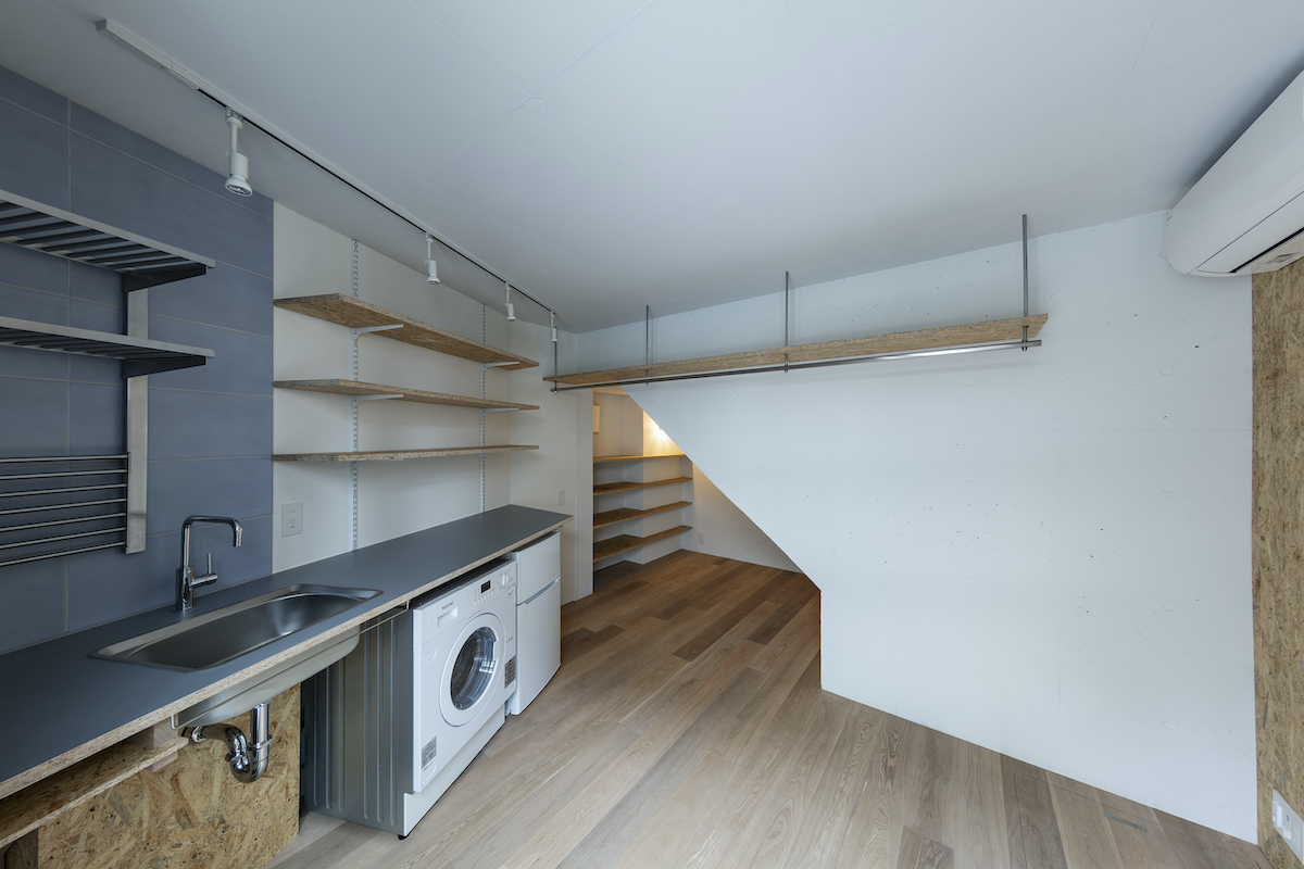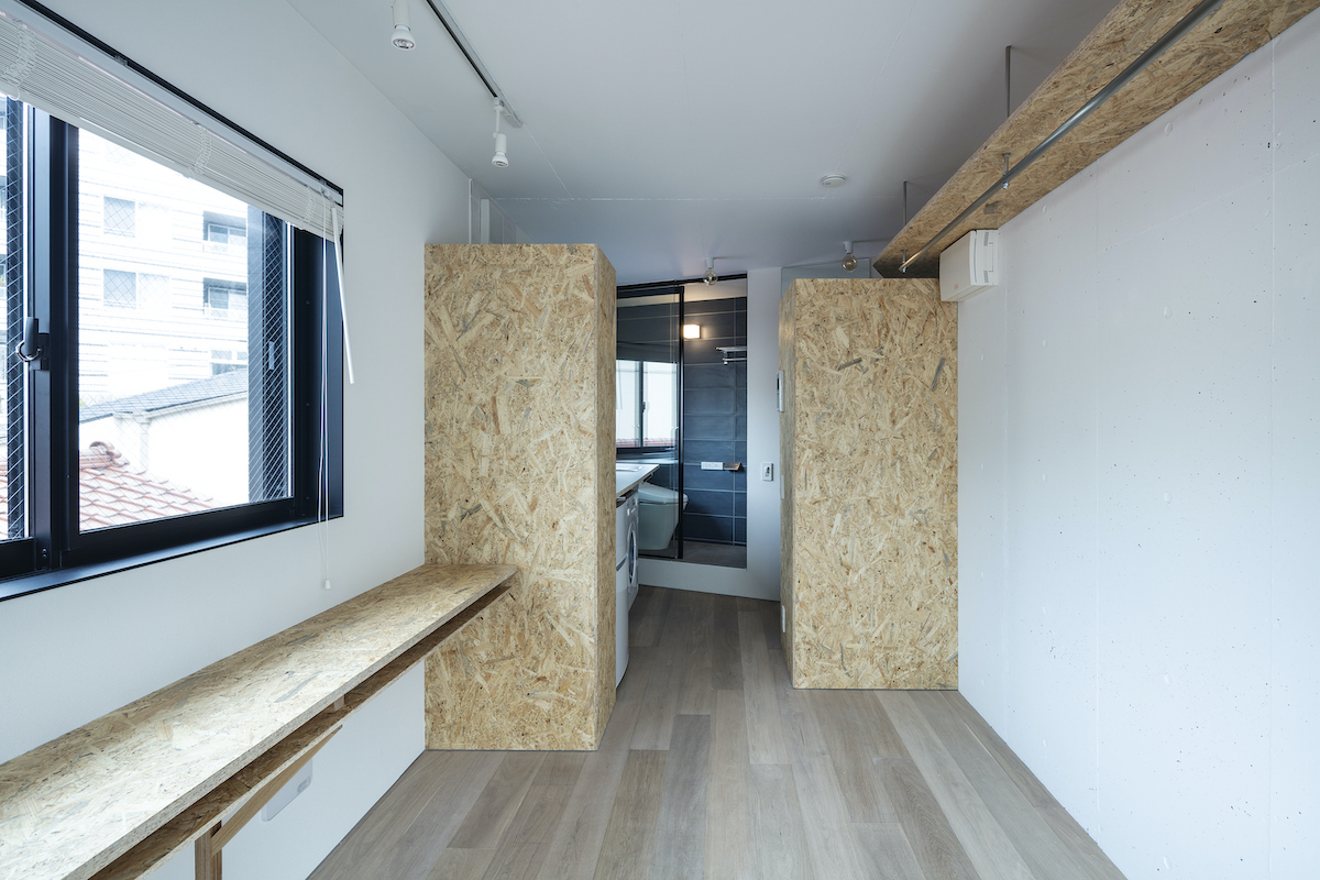 1階4室と2階2室は長屋とし、外部から直接アクセスできる独立性の高い部屋としている。タイプは13m2のワンルームから38m2の2LDKまで豊富に用意し、様々なライフスタイルに対応できるようにしました。内部のしつらえは、賃貸マンションではあまり見られない要素(荷物を置けるベンチ、隙間を利用した収納、ウエアを収納できるハンガーパイプ棚、姿見鏡、すぐに仕事にとりかかれるデスク)を用意し、ホテルと住居の中間のような機能を持つ集合住宅を目指しました。