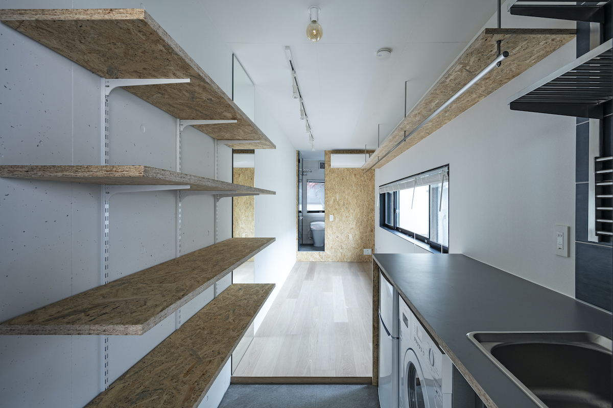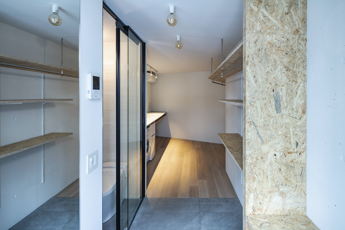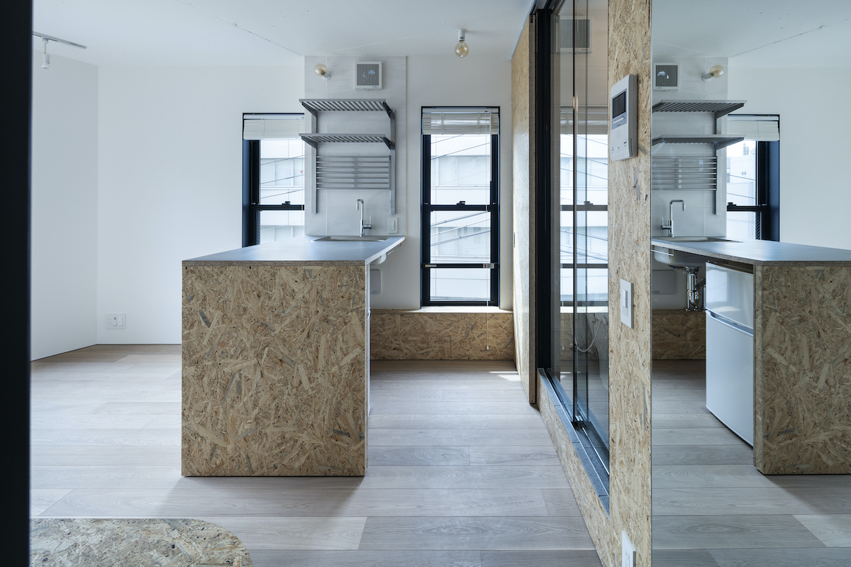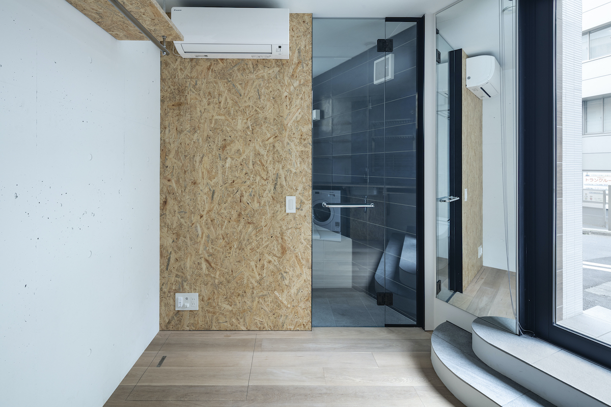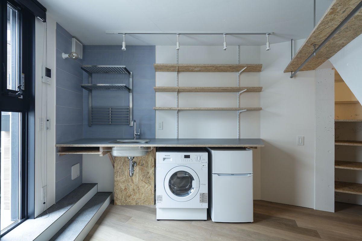 1階4室と2階2室は長屋とし、外部から直接アクセスできる独立性の高い部屋としている。タイプは13m2のワンルームから38m2の2LDKまで豊富に用意し、様々なライフスタイルに対応できるようにしました。内部のしつらえは、賃貸マンションではあまり見られない要素(荷物を置けるベンチ、隙間を利用した収納、ウエアを収納できるハンガーパイプ棚、姿見鏡、すぐに仕事にとりかかれるデスク)を用意し、ホテルと住居の中間のような機能を持つ集合住宅を目指しました。
