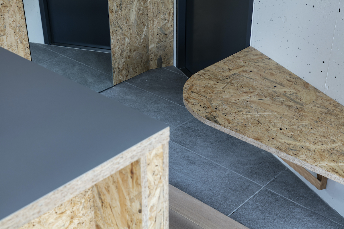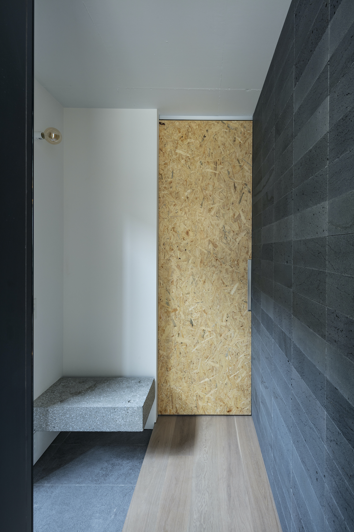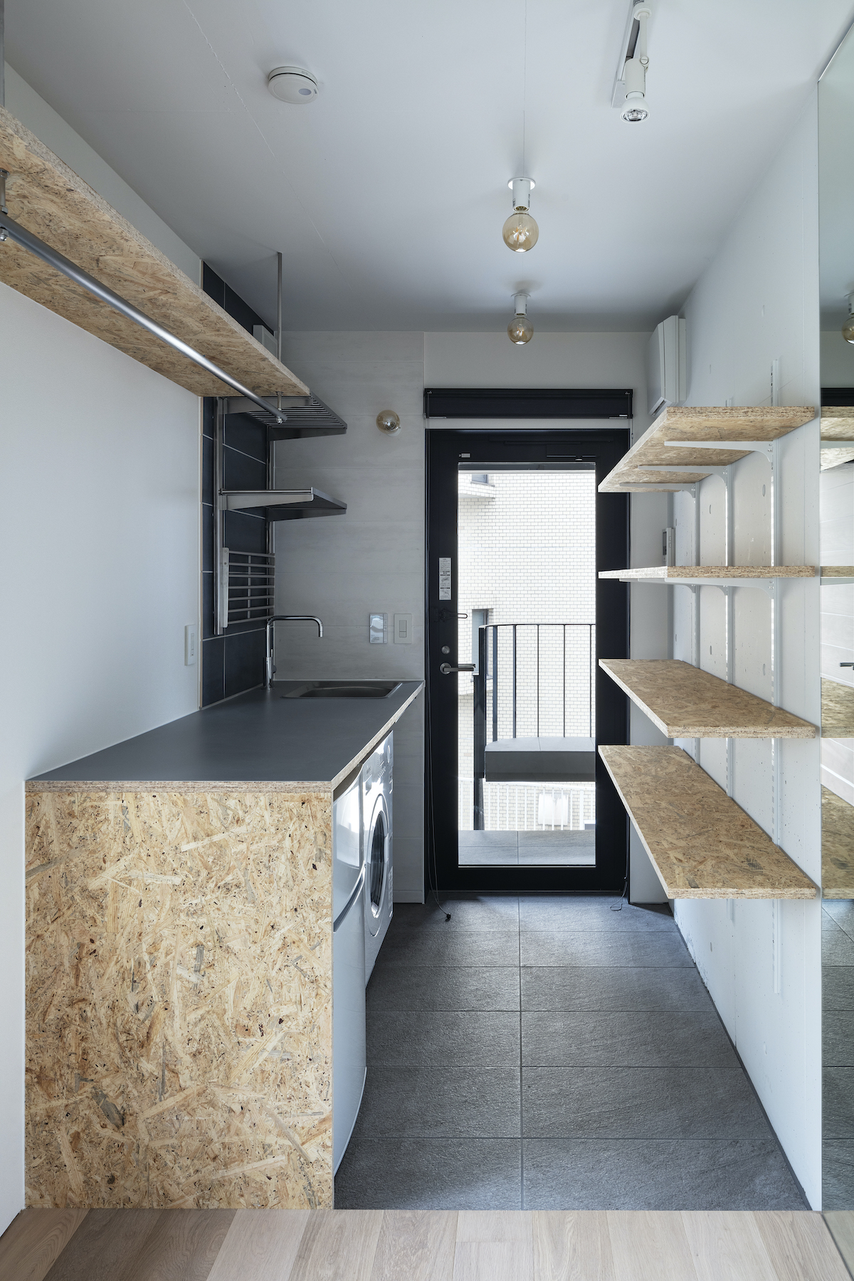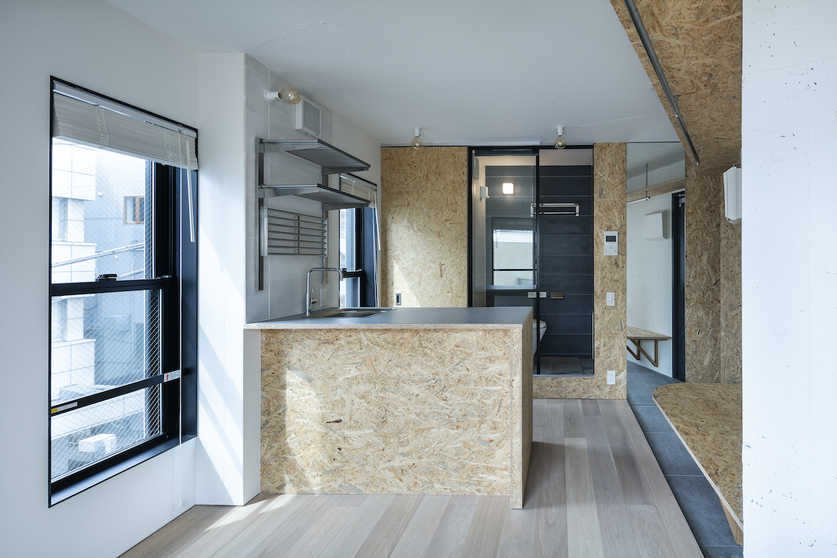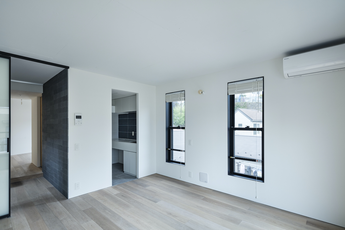 1階4室と2階2室は長屋とし、外部から直接アクセスできる独立性の高い部屋としている。タイプは13m2のワンルームから38m2の2LDKまで豊富に用意し、様々なライフスタイルに対応できるようにしました。内部のしつらえは、賃貸マンションではあまり見られない要素(荷物を置けるベンチ、隙間を利用した収納、ウエアを収納できるハンガーパイプ棚、姿見鏡、すぐに仕事にとりかかれるデスク)を用意し、ホテルと住居の中間のような機能を持つ集合住宅を目指しました。