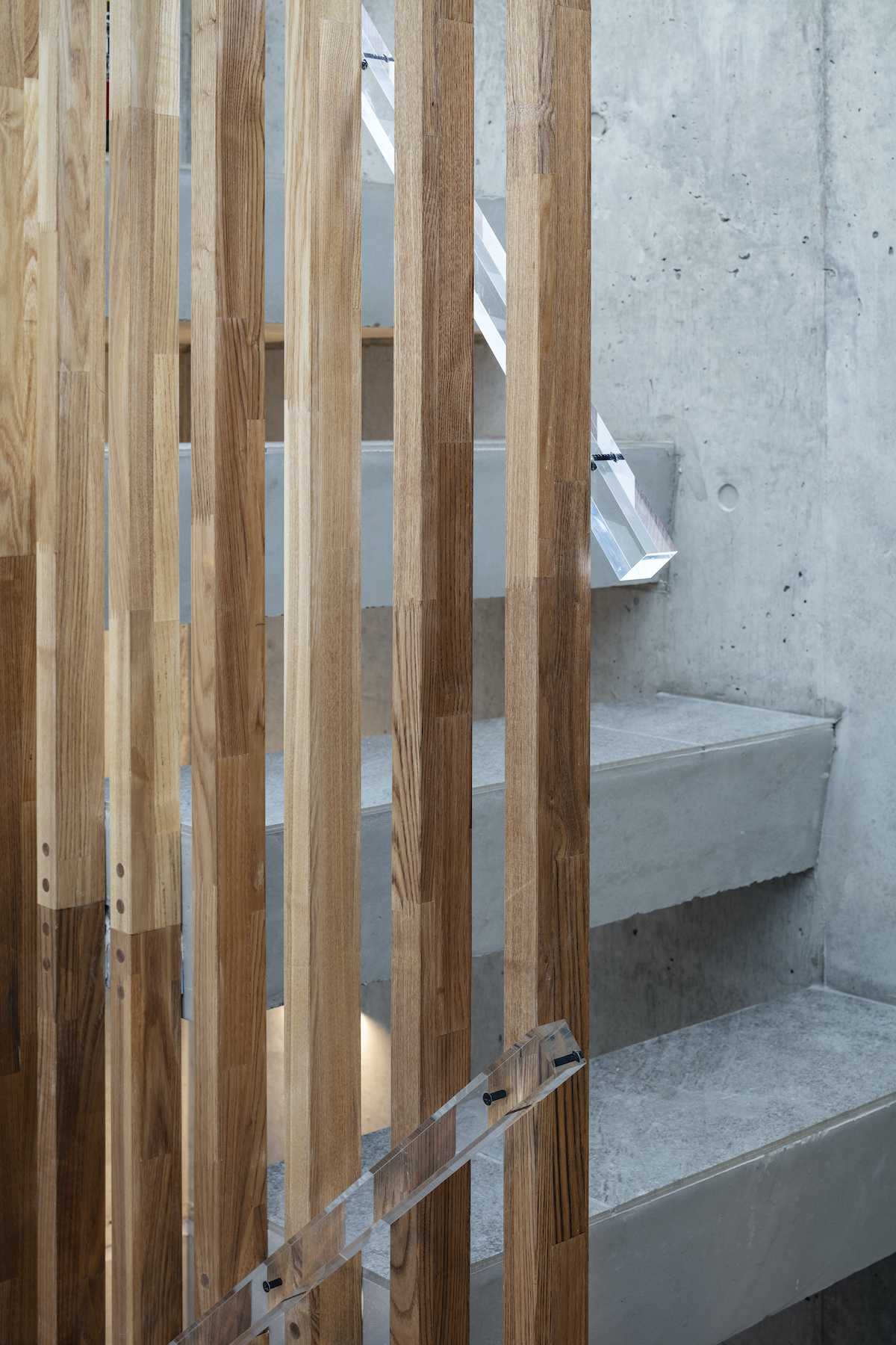 階段縦格子はタモ、手すりは透明アクリル