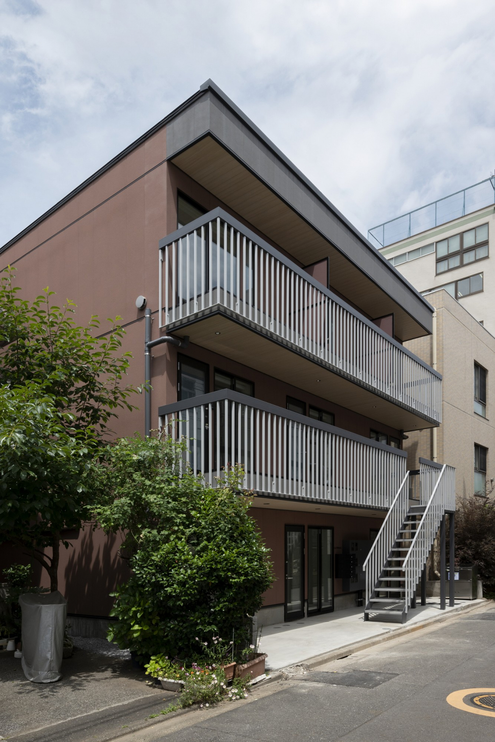 1階は2つのテナント、2-3階はメゾネット形式の集合住宅が3戸入る。構造は木造。木造3階建て共同住宅。法規的にはいわゆる木三共。