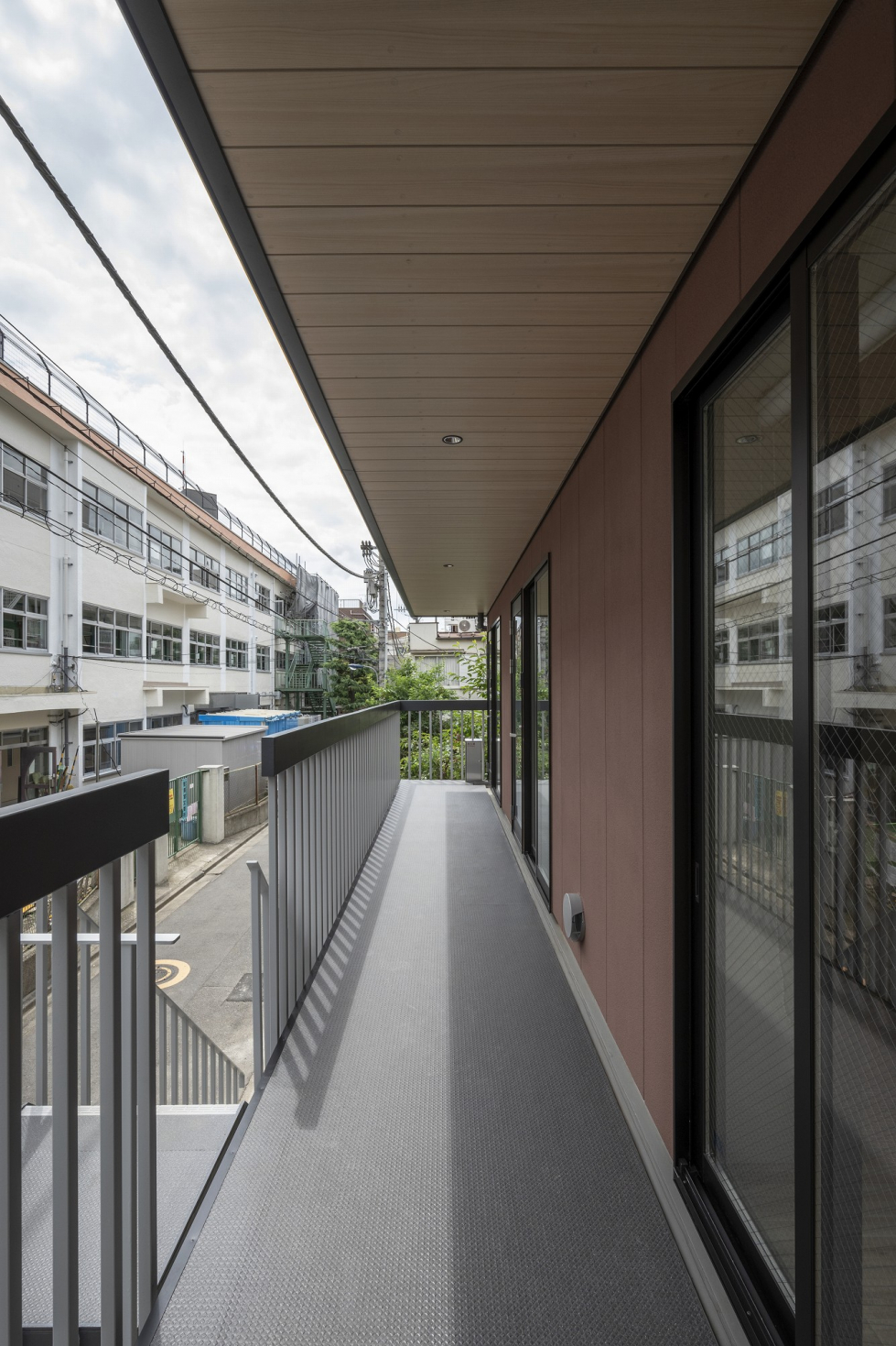 2階共用廊下。床は防水の上、清掃性を考慮して、長尺シート張り。