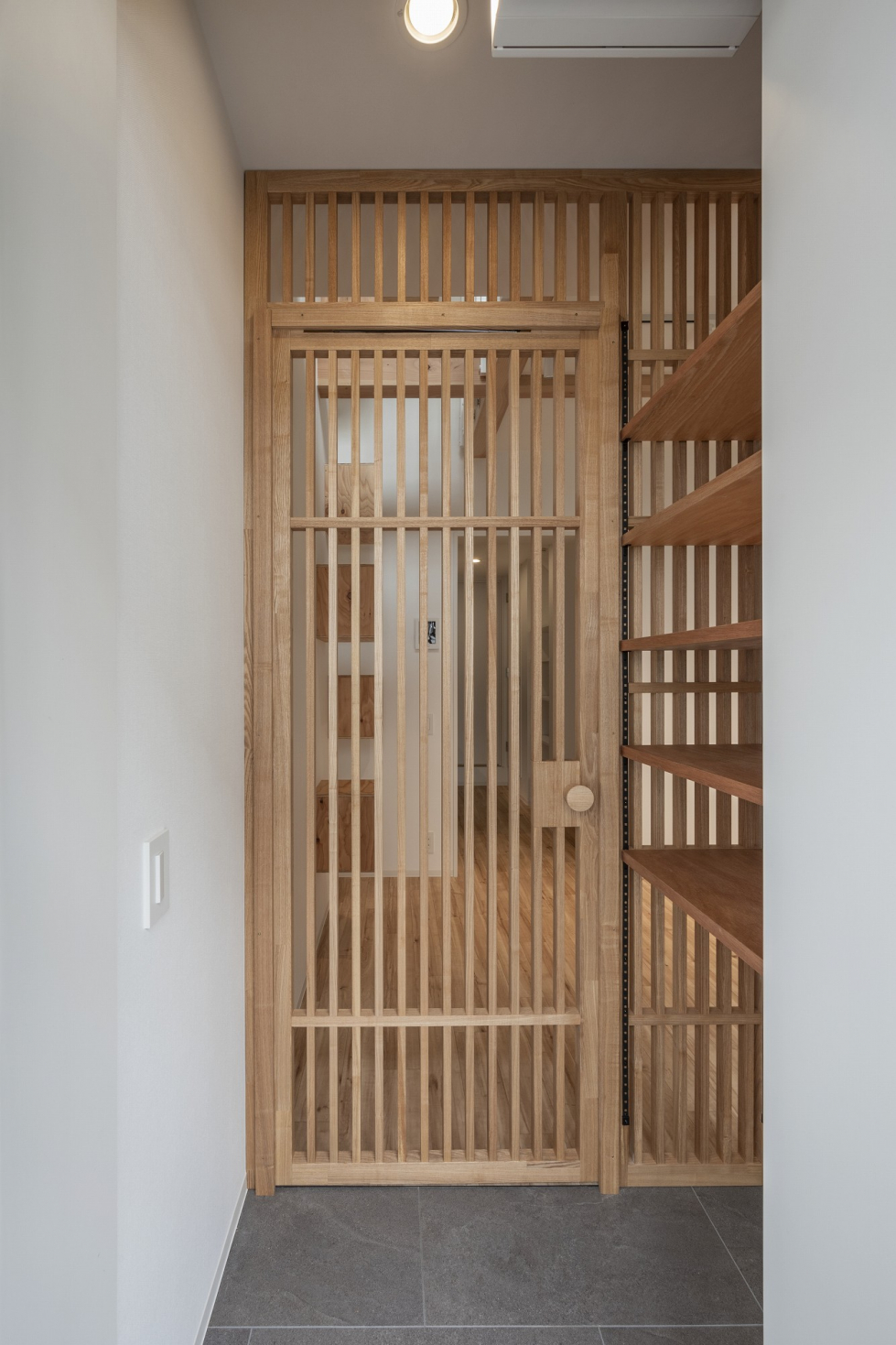 玄関。視認性を高めつつ、猫ちゃんが飛び出さないようルーバーで仕切られている。