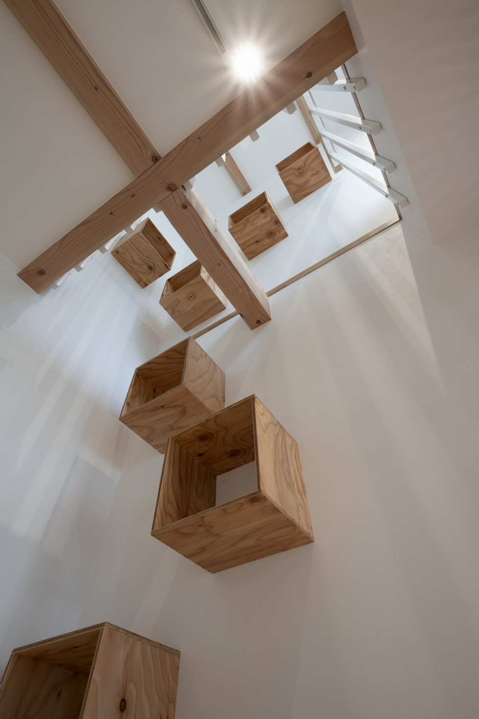 キャットタワーを見上げる。梁は燃え代設計によるあらわしとした。