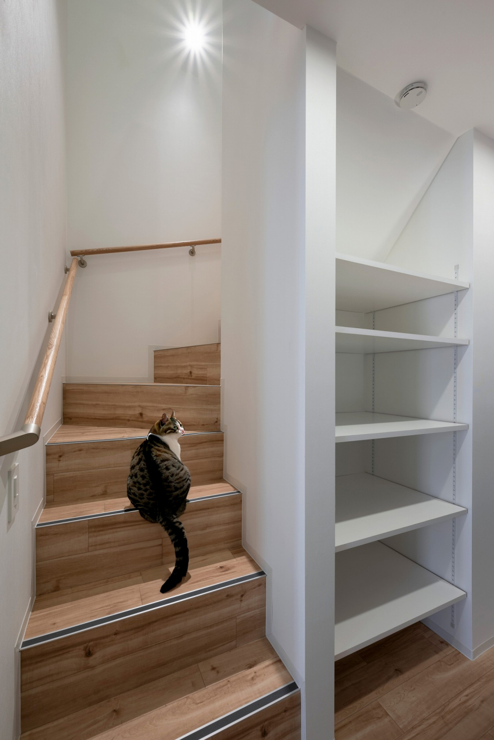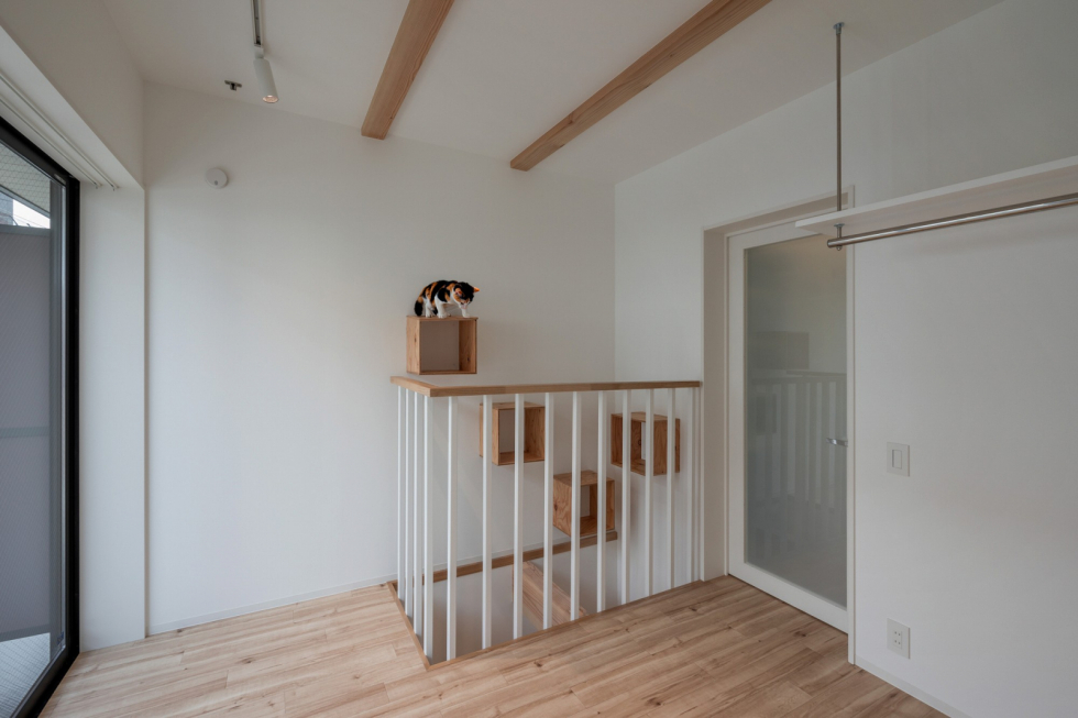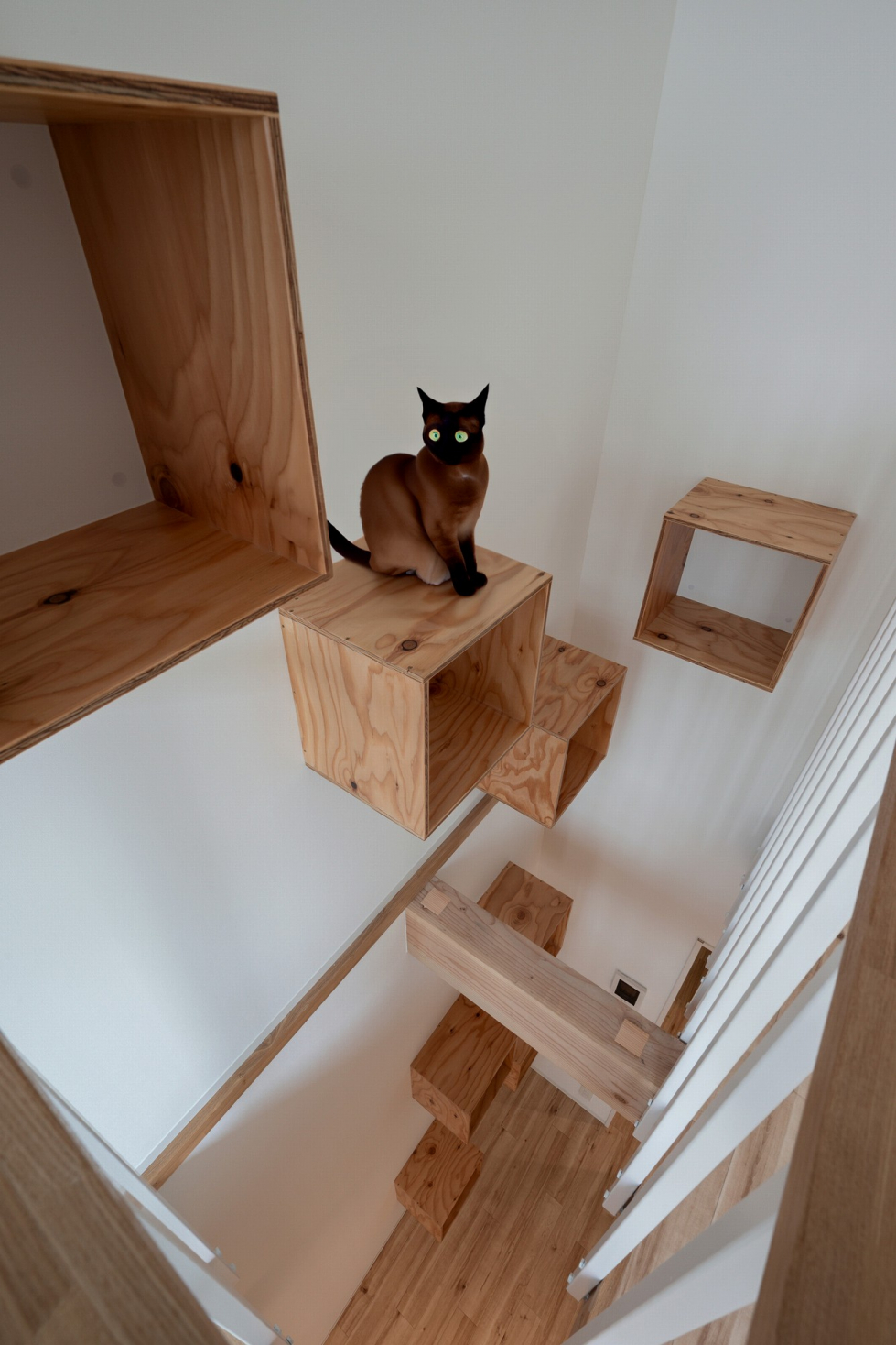 さらに特色を出すために「ペット(猫)専用マンション」として貸し出せるよう随所に手を加えた。帰宅しても猫が飛び出さないようにルーバーで仕切られた玄関、2階までつながるキャットタワー、トイレに自由に行き来できるように扉に付けられた小窓など。床材はフローリングに見えるが、人にも猫にも優しい消臭効果付きのクッションフロアである。