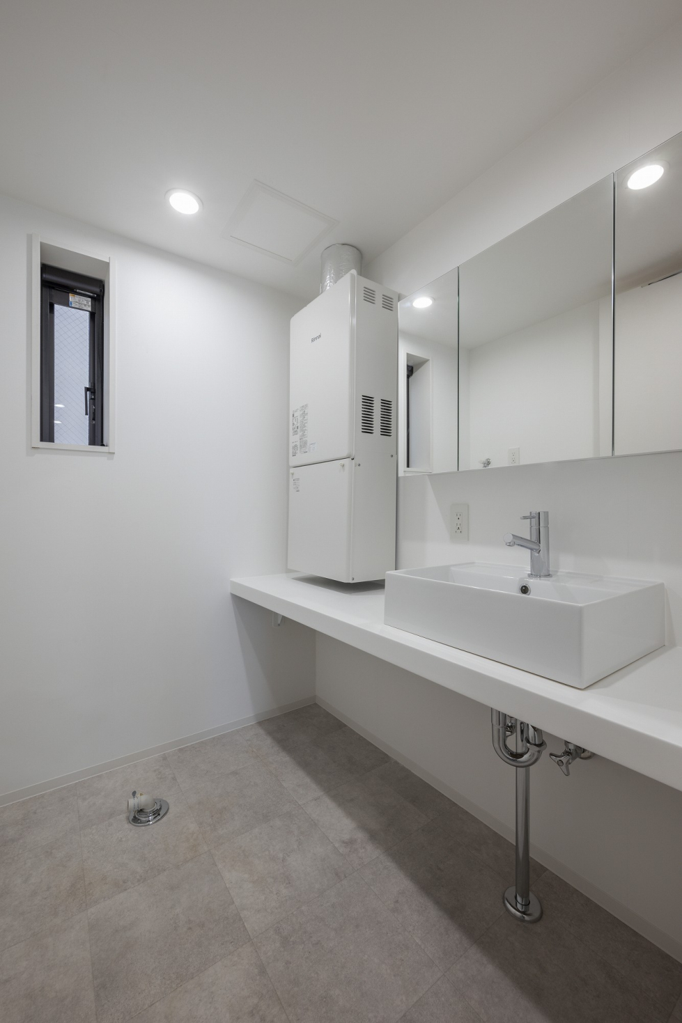 洗面所。洗面台の下はオープンにすることで、猫用トイレなどを自由に置けるようにした。