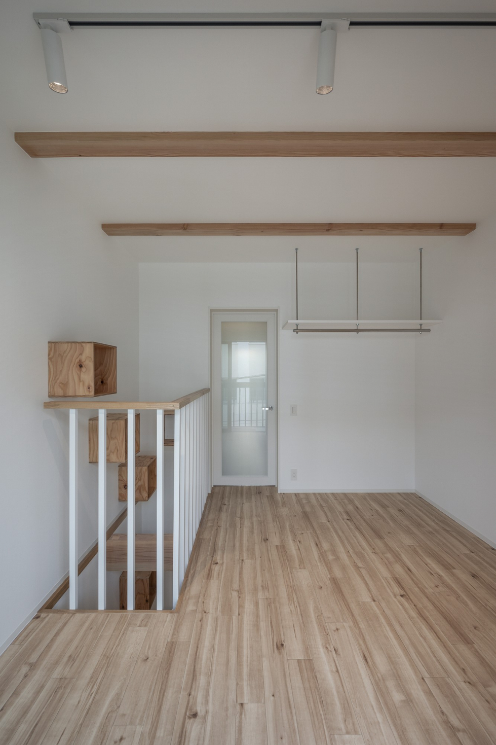 階段室に大きめの収納を設けたので、寝室内は簡易的なハンガーパイプのみにすることで仕事部屋としても広々と使えるようにした。
