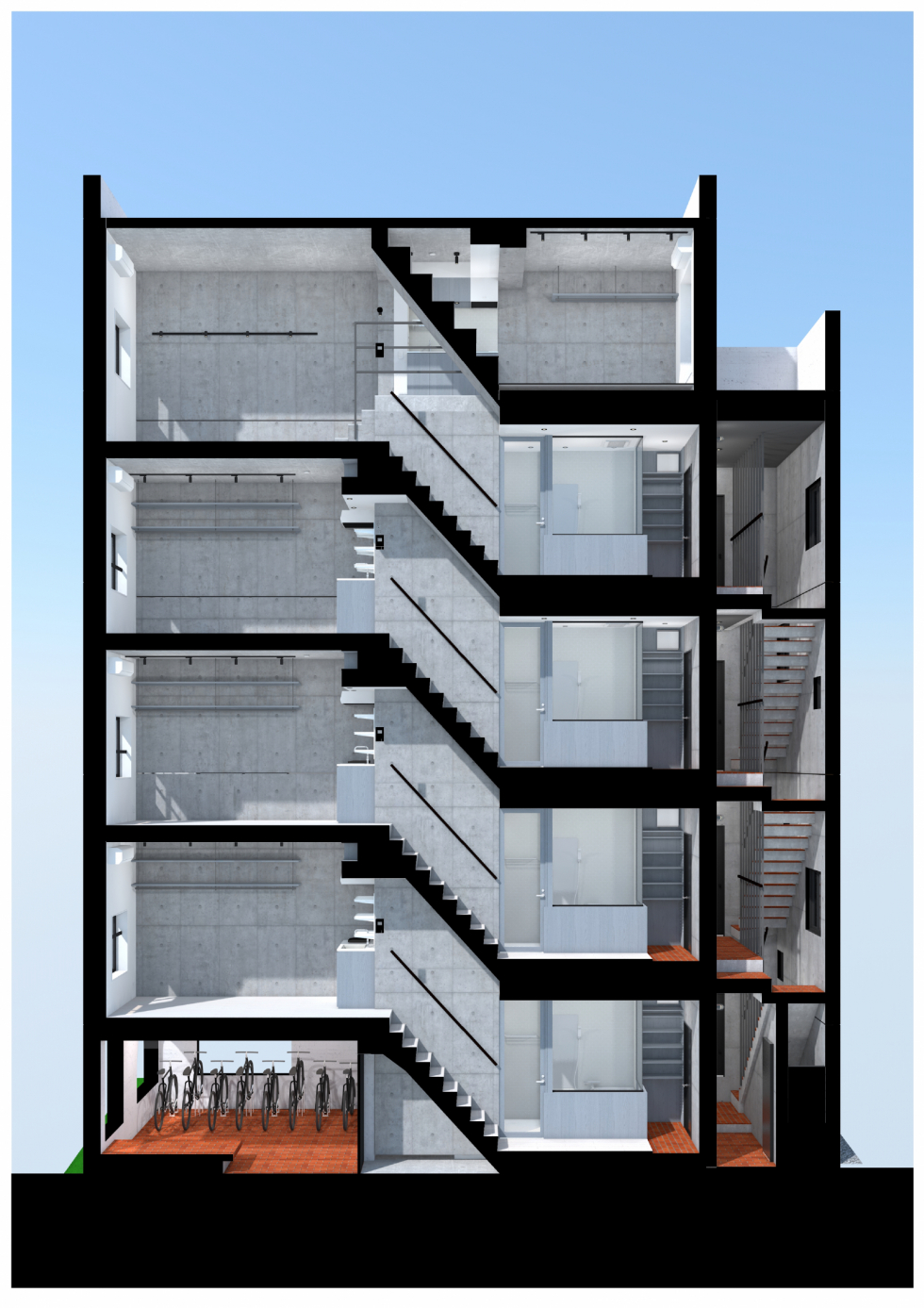 そこで細長い敷地を縦方向に2分割してワンルームの部屋を並べ、居室部分を持ち上げてその下に駐輪スペースを確保した。