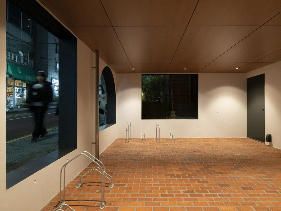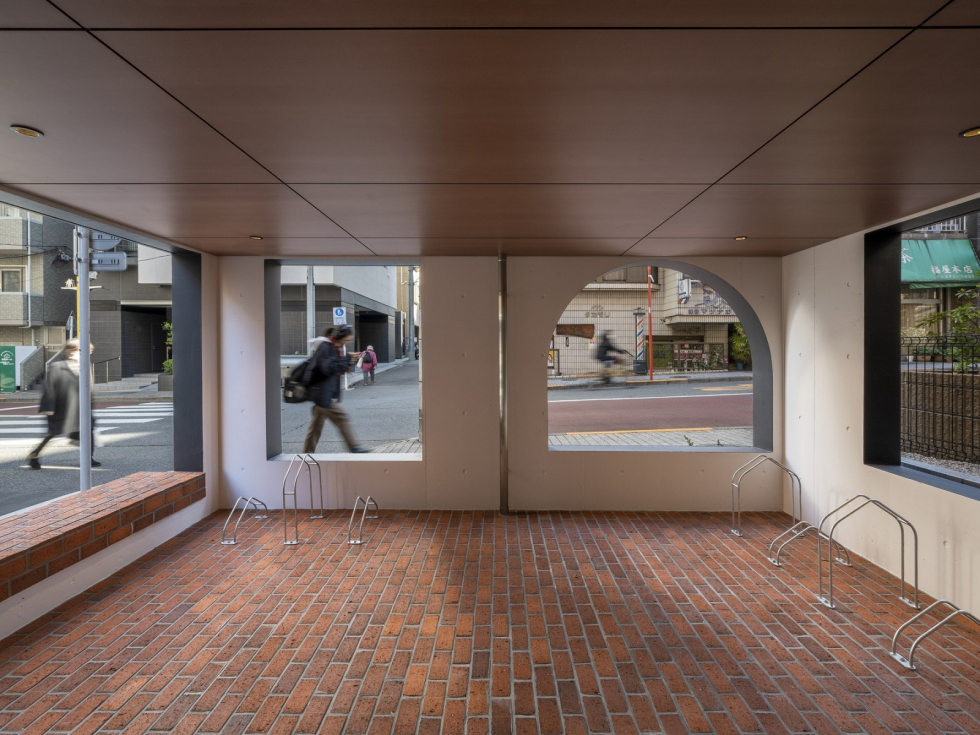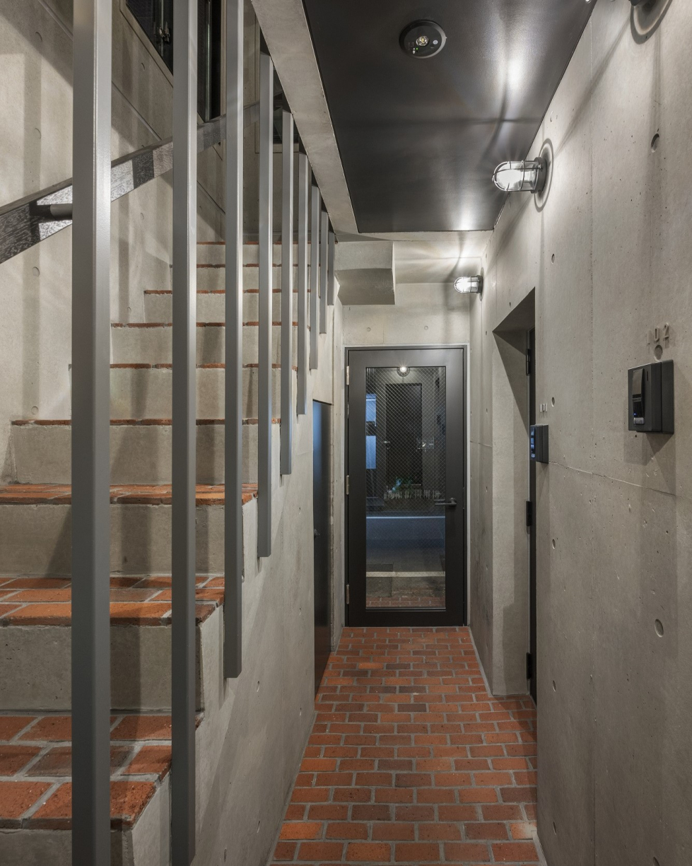 共用階段。床材は駐輪スペースと同じレンガタイル張りとした。街がそのまま内部へ延長しているイメージ。