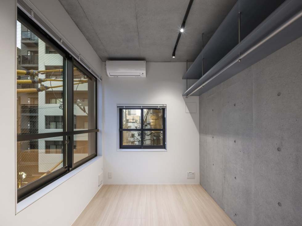 外壁はコンクリート打ち放しに撥水剤で着色を施した。色は両サイドに立つ建物の中間色ぐらいにして街になじませた。
