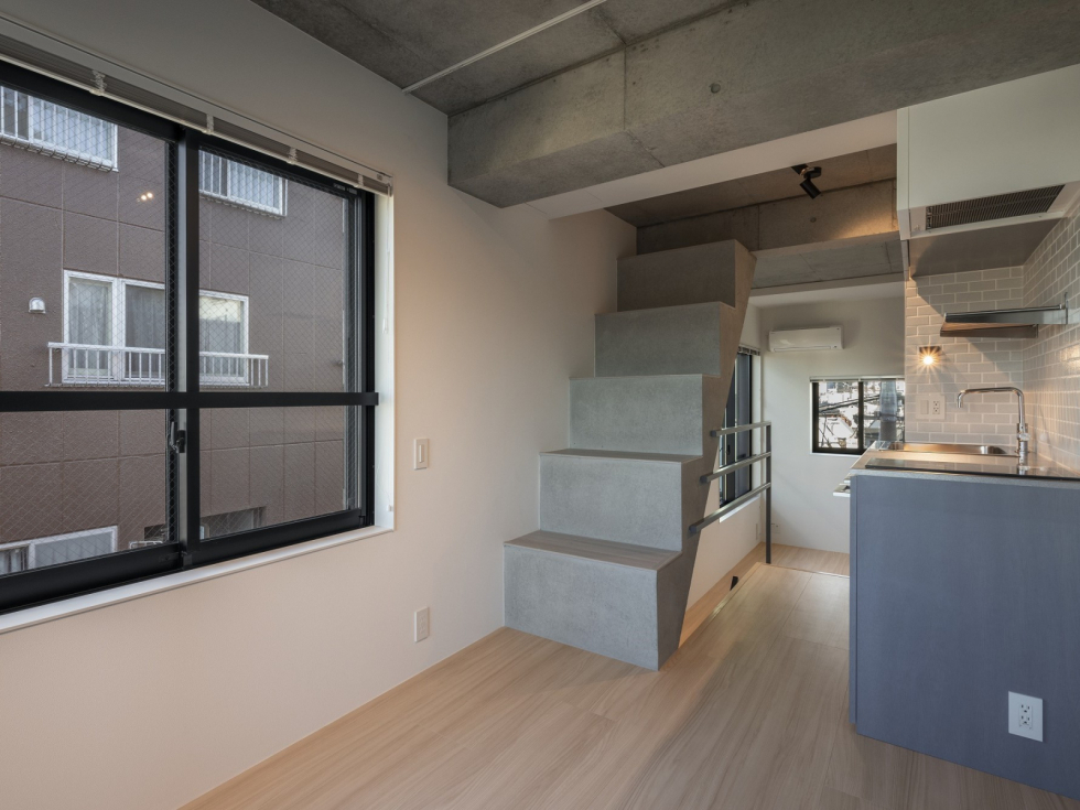 |用途 : 共同住宅 8戸|計画地 : 東京都中野区弥生町|敷地面積 : 65.26m2(19.7坪)|建築面積 : 50.40m2(15.24坪)|建ぺい率:77.23% / 100.00%|施工床面積 : 243.45m2(73.6坪)|容積率:304.77% / 400.00%|構造・規模 : WRC造・地上5階建て|設計 : 2021年9月-2022年2月|施工 : 2022年3月-2022年12月|
