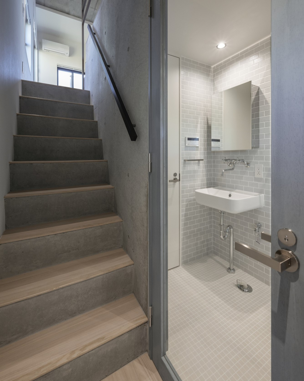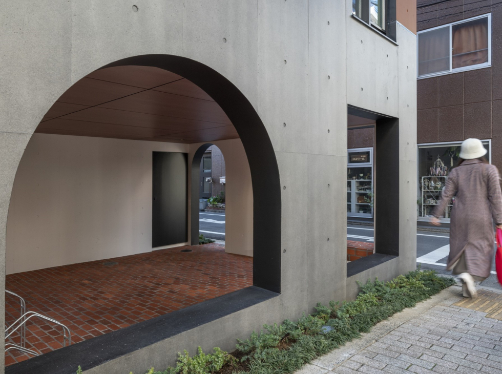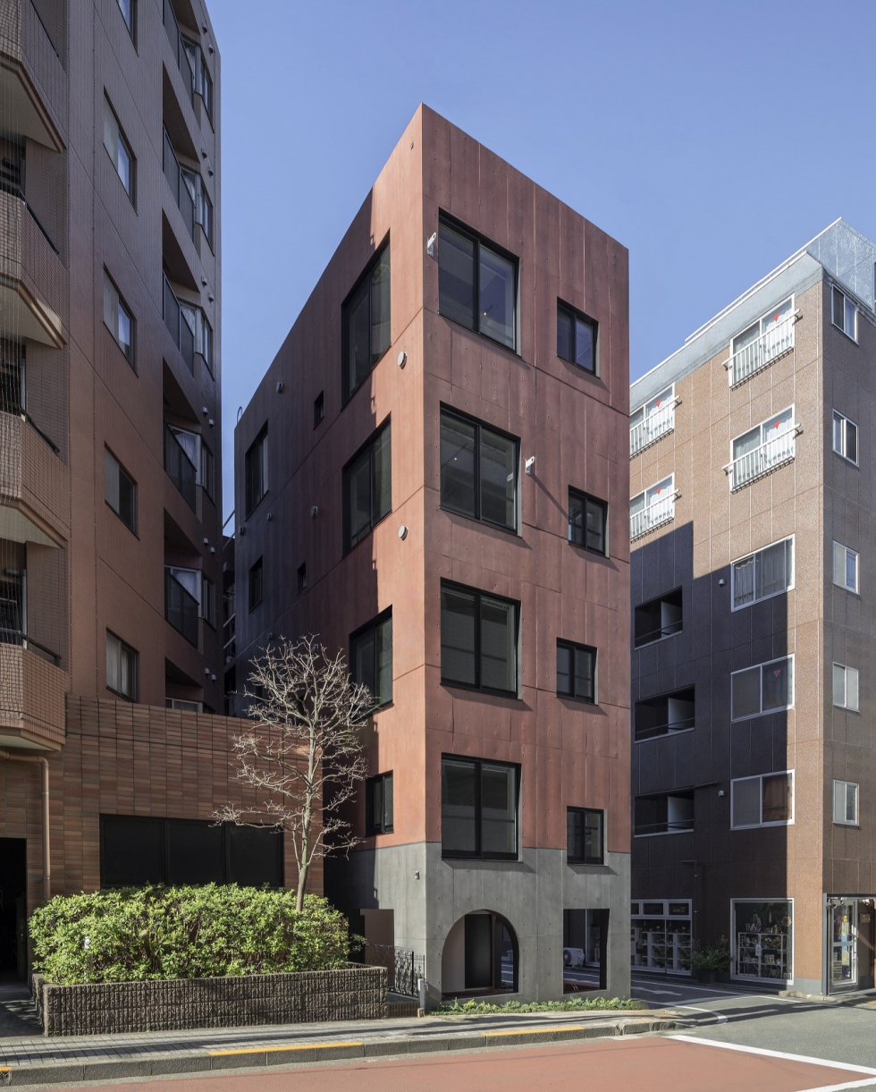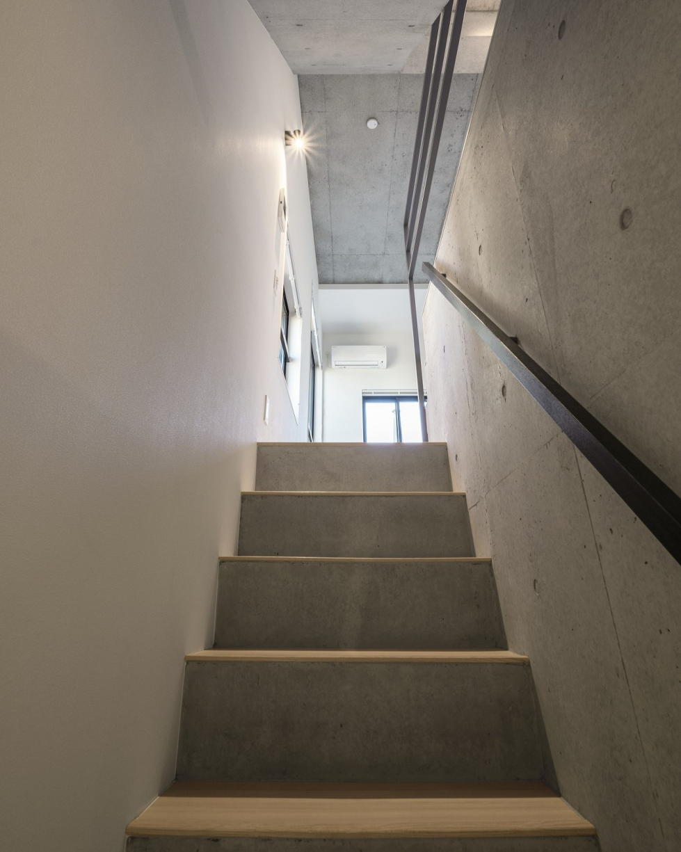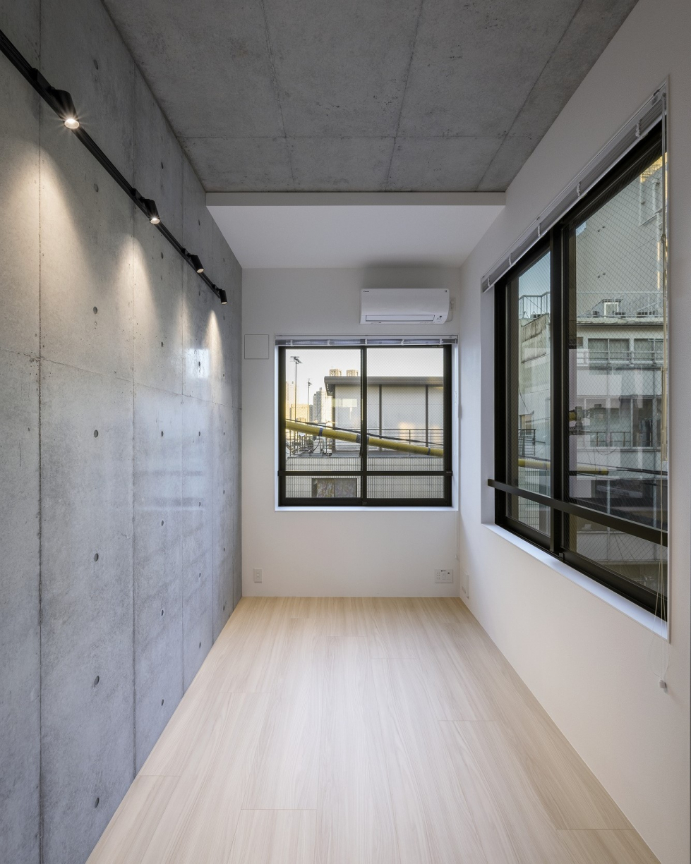 外壁はコンクリート打ち放しに撥水剤で着色を施した。色は両サイドに立つ建物の中間色ぐらいにして街になじませた。