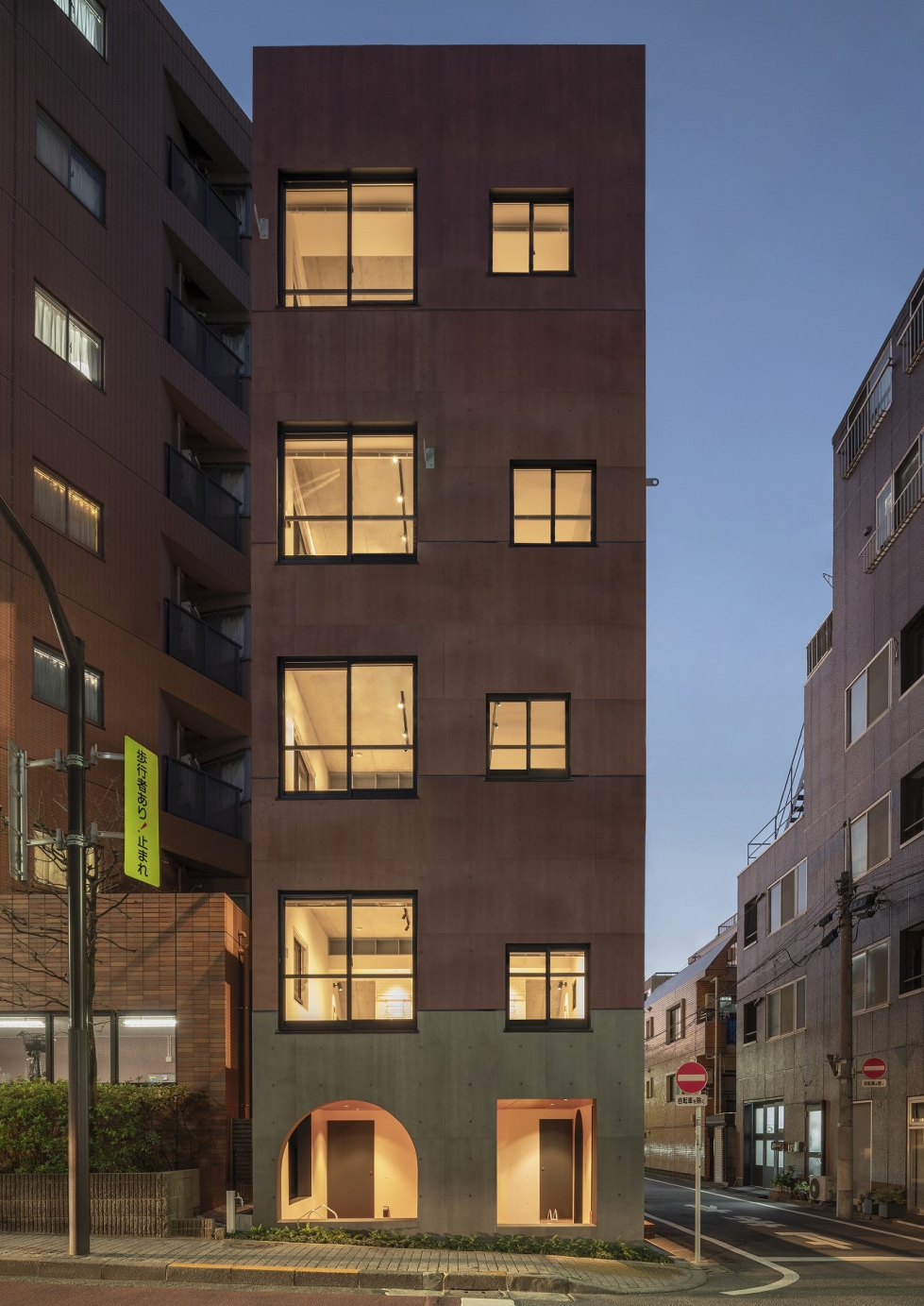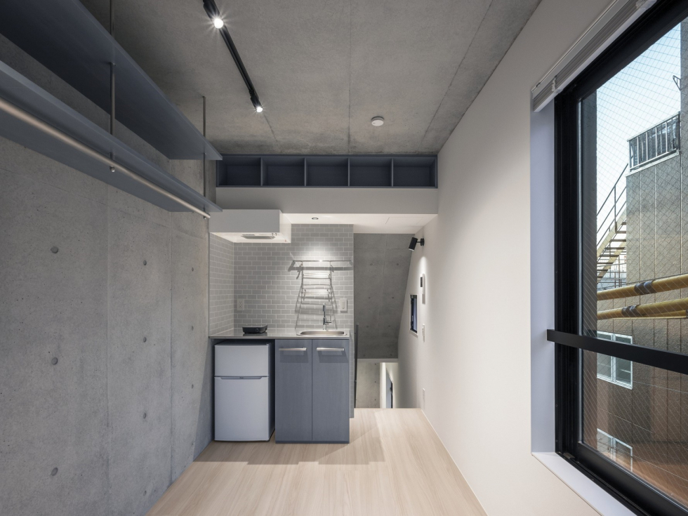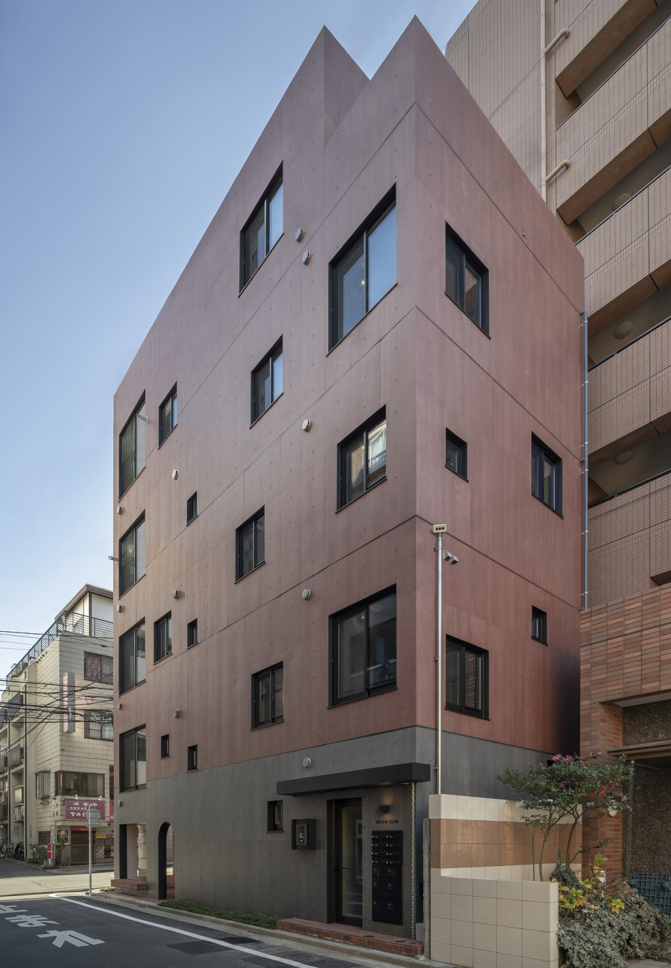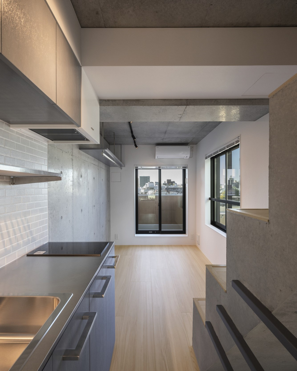 |用途 : 共同住宅 8戸|計画地 : 東京都中野区弥生町|敷地面積 : 65.26m2(19.7坪)|建築面積 : 50.40m2(15.24坪)|建ぺい率:77.23% / 100.00%|施工床面積 : 243.45m2(73.6坪)|容積率:304.77% / 400.00%|構造・規模 : WRC造・地上5階建て|設計 : 2021年9月-2022年2月|施工 : 2022年3月-2022年12月|