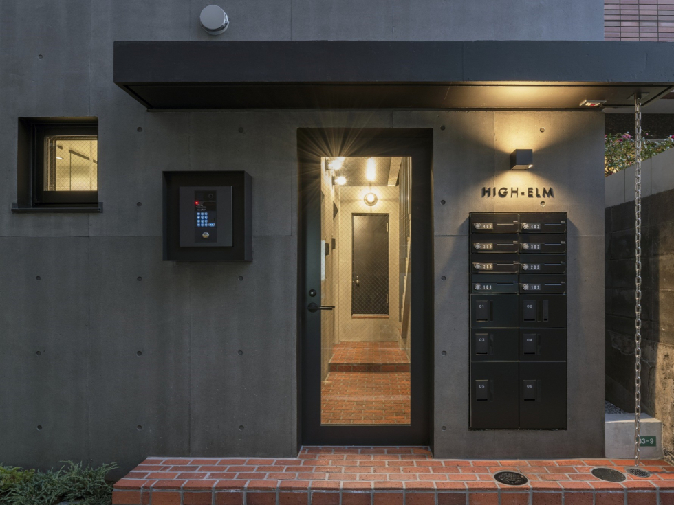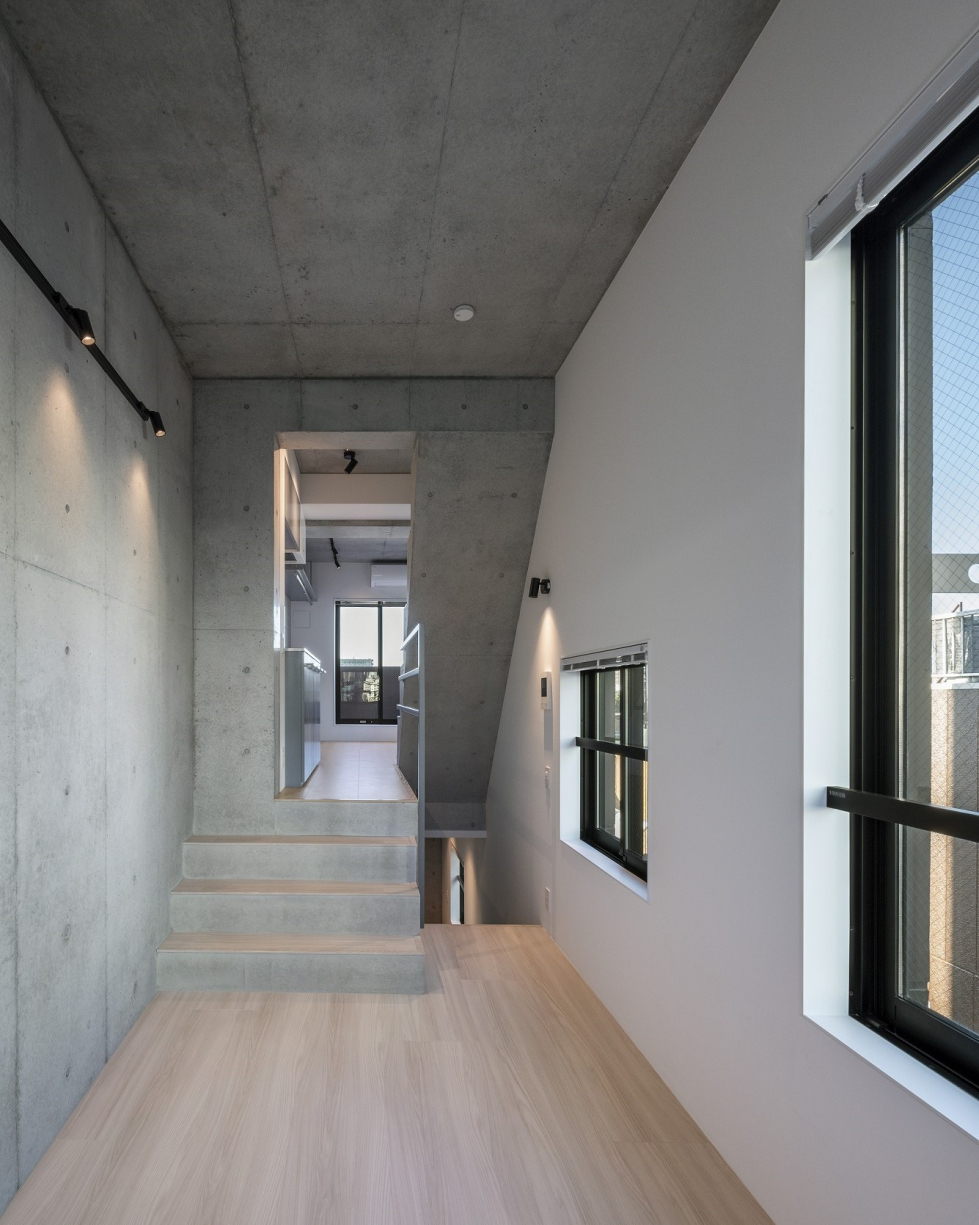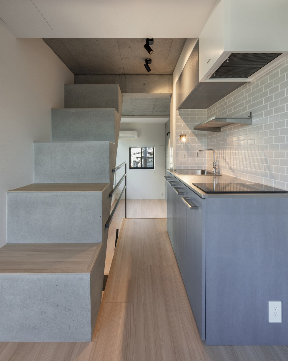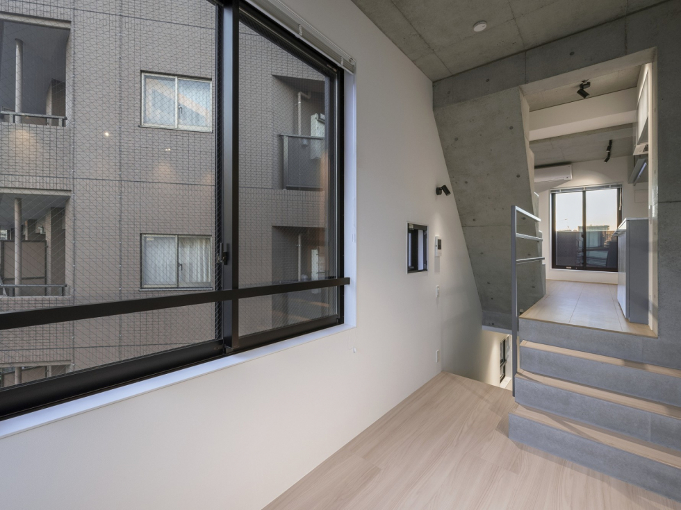 |用途 : 共同住宅 8戸|計画地 : 東京都中野区弥生町|敷地面積 : 65.26m2(19.7坪)|建築面積 : 50.40m2(15.24坪)|建ぺい率:77.23% / 100.00%|施工床面積 : 243.45m2(73.6坪)|容積率:304.77% / 400.00%|構造・規模 : WRC造・地上5階建て|設計 : 2021年9月-2022年2月|施工 : 2022年3月-2022年12月|