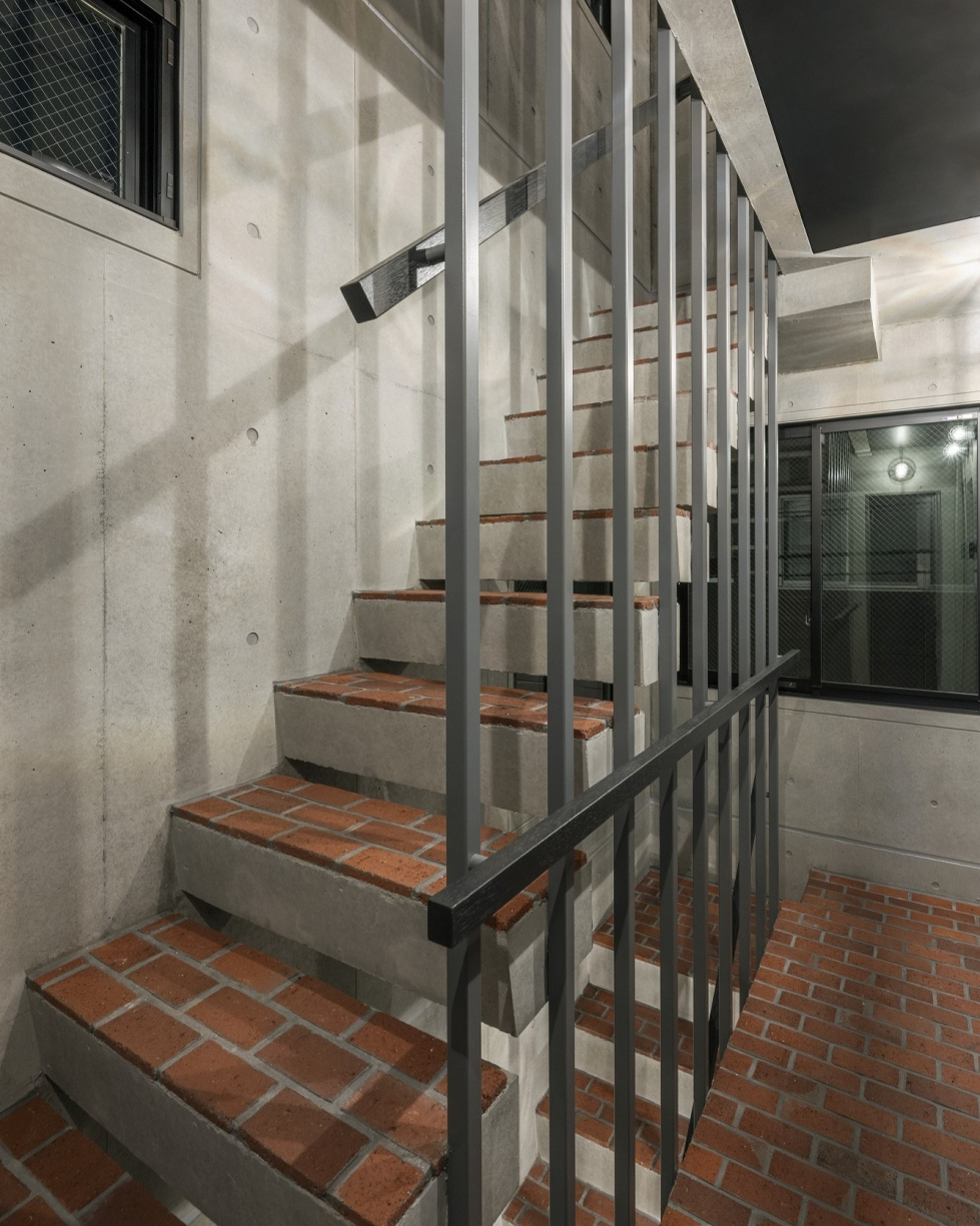 共用階段。床材は駐輪スペースと同じレンガタイル張りとした。街がそのまま内部へ延長しているイメージ。