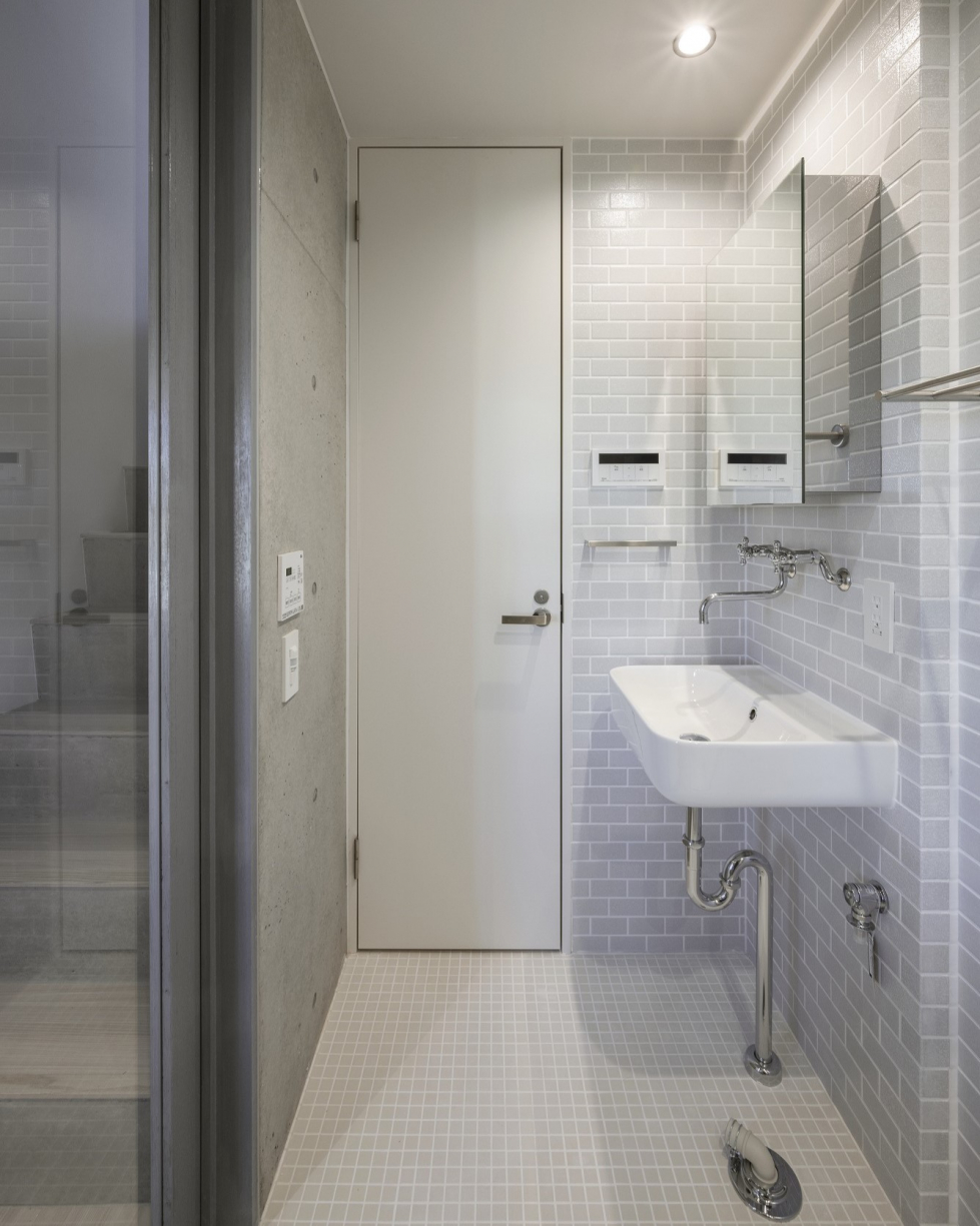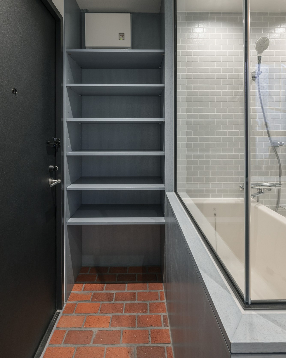 浴室側から玄関方向を見る。玄関床までレンガタイルが連続している。