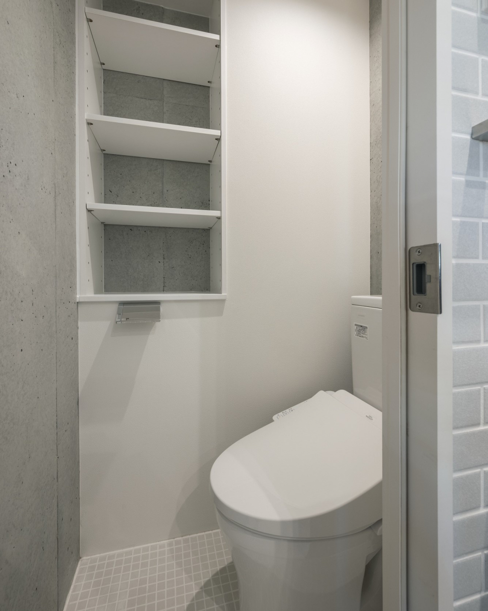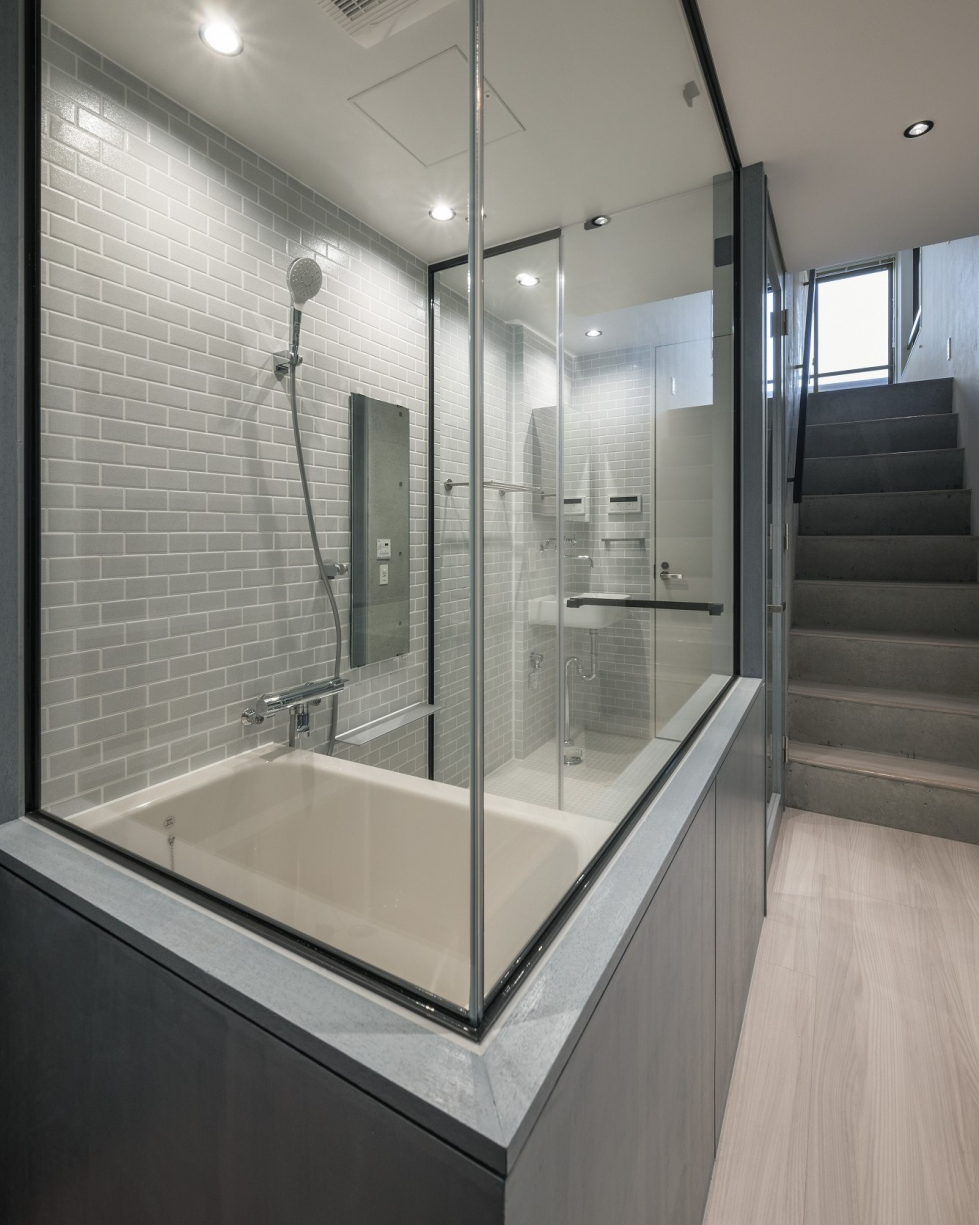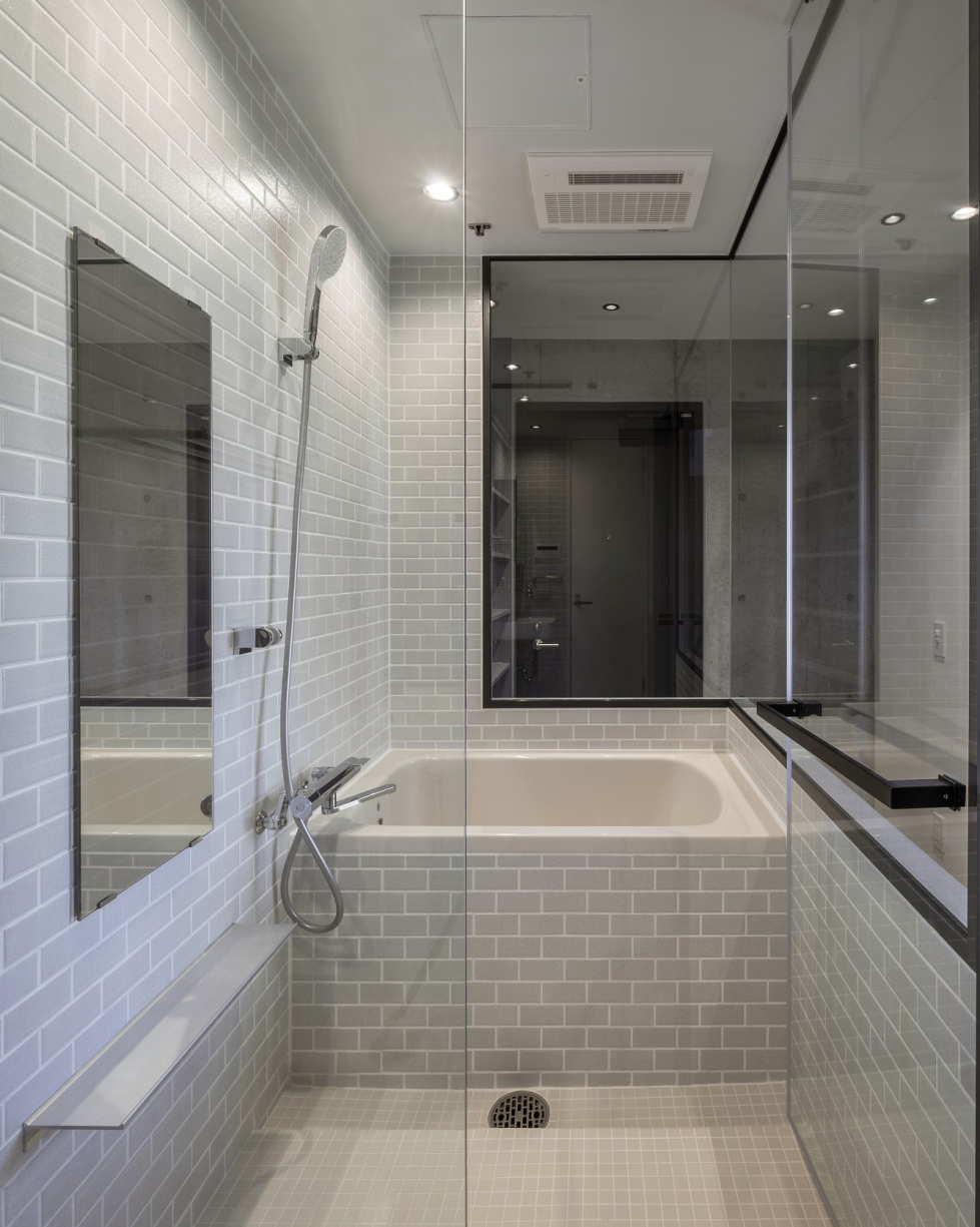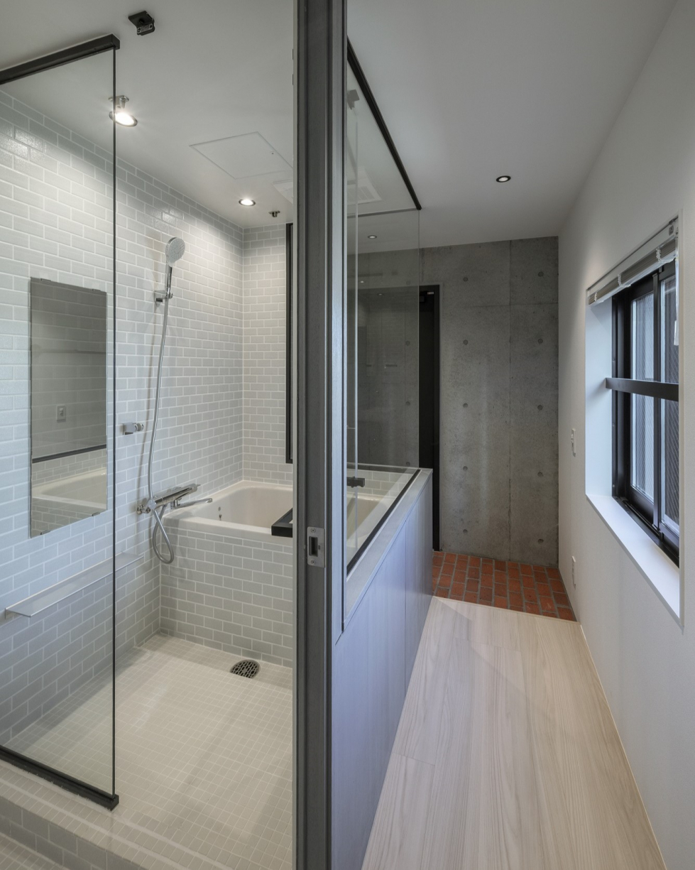 浴室はオーナーの要望で造作。浴室、洗面、奥にトイレ。