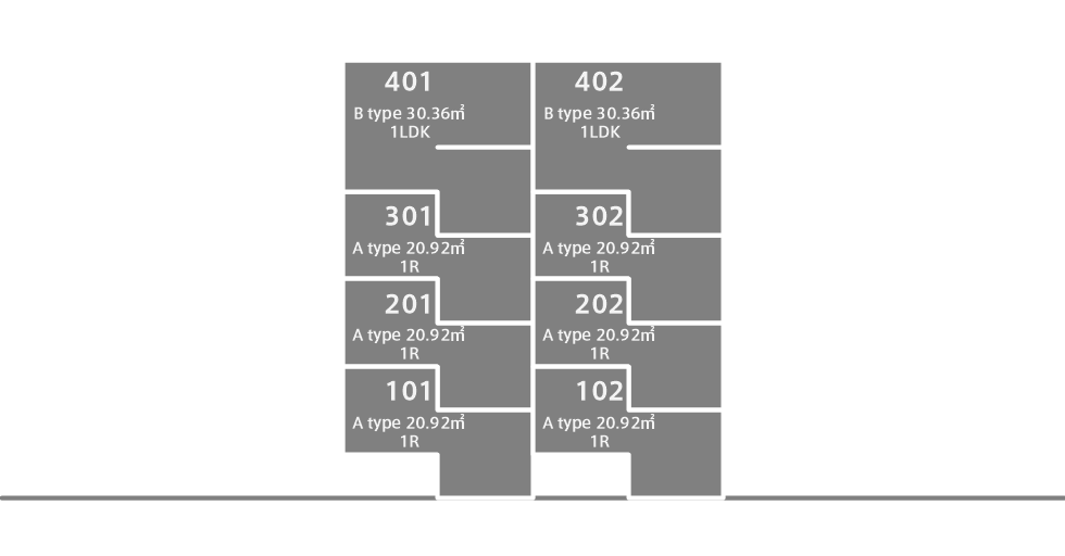 そこで細長い敷地を縦方向に2分割してワンルームの部屋を並べ、居室部分を持ち上げてその下に駐輪スペースを確保した。