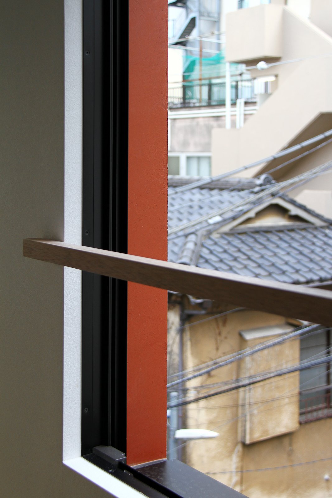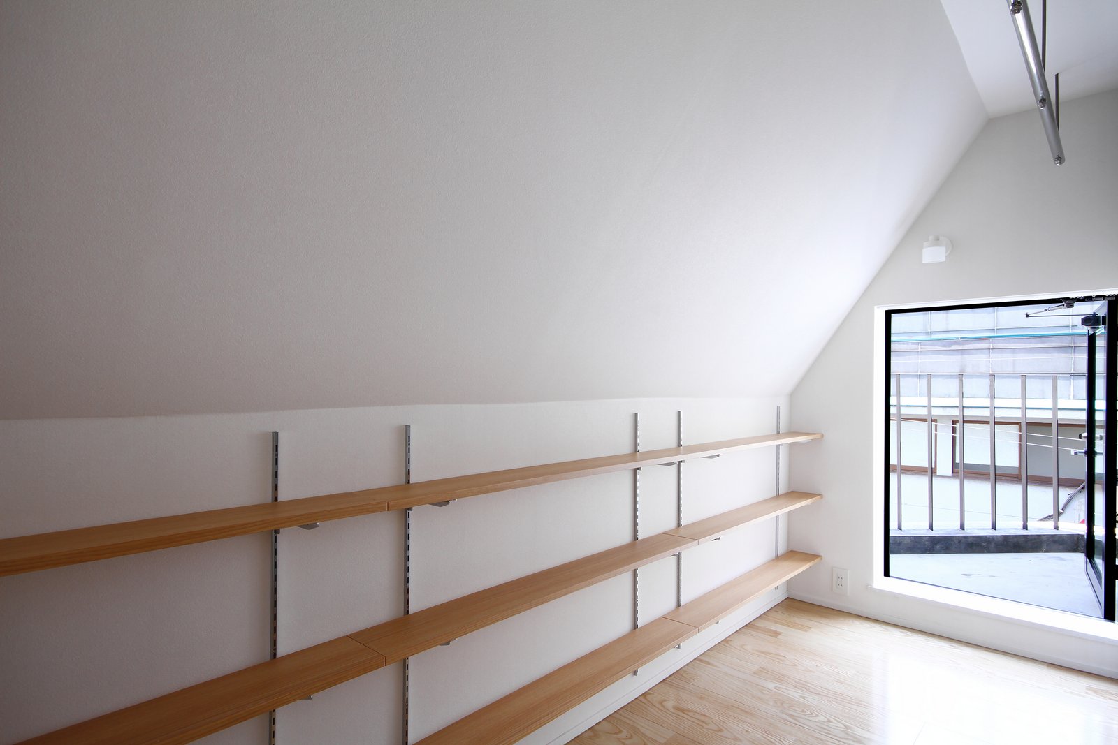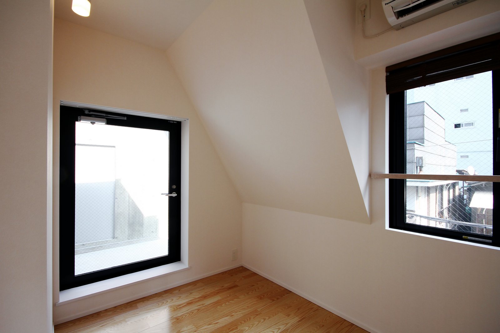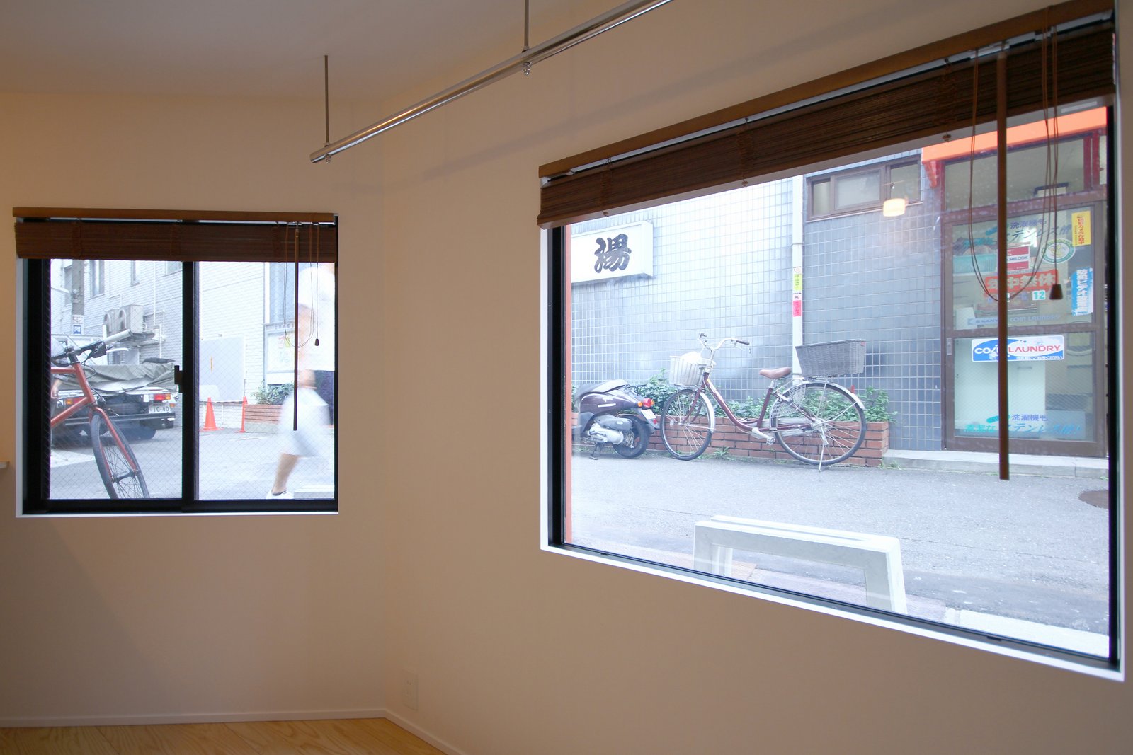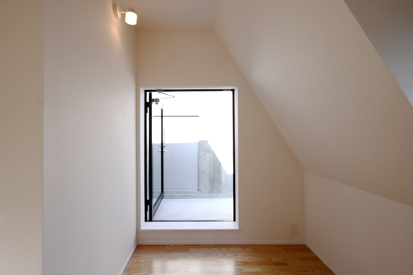 道路に面した窓は両開き窓となっており、小さな部屋の壁の一部がすっぽりと切り取られたような開放感がもたらされている。