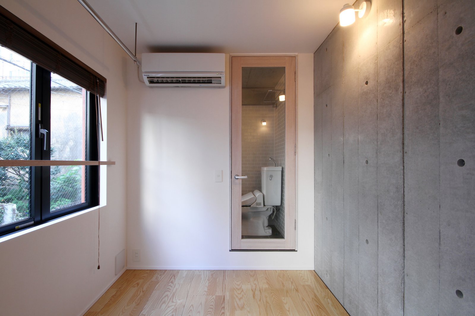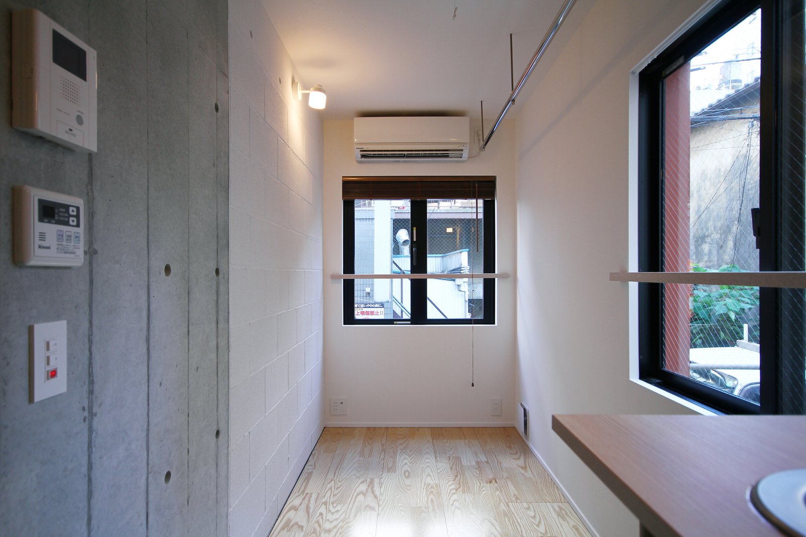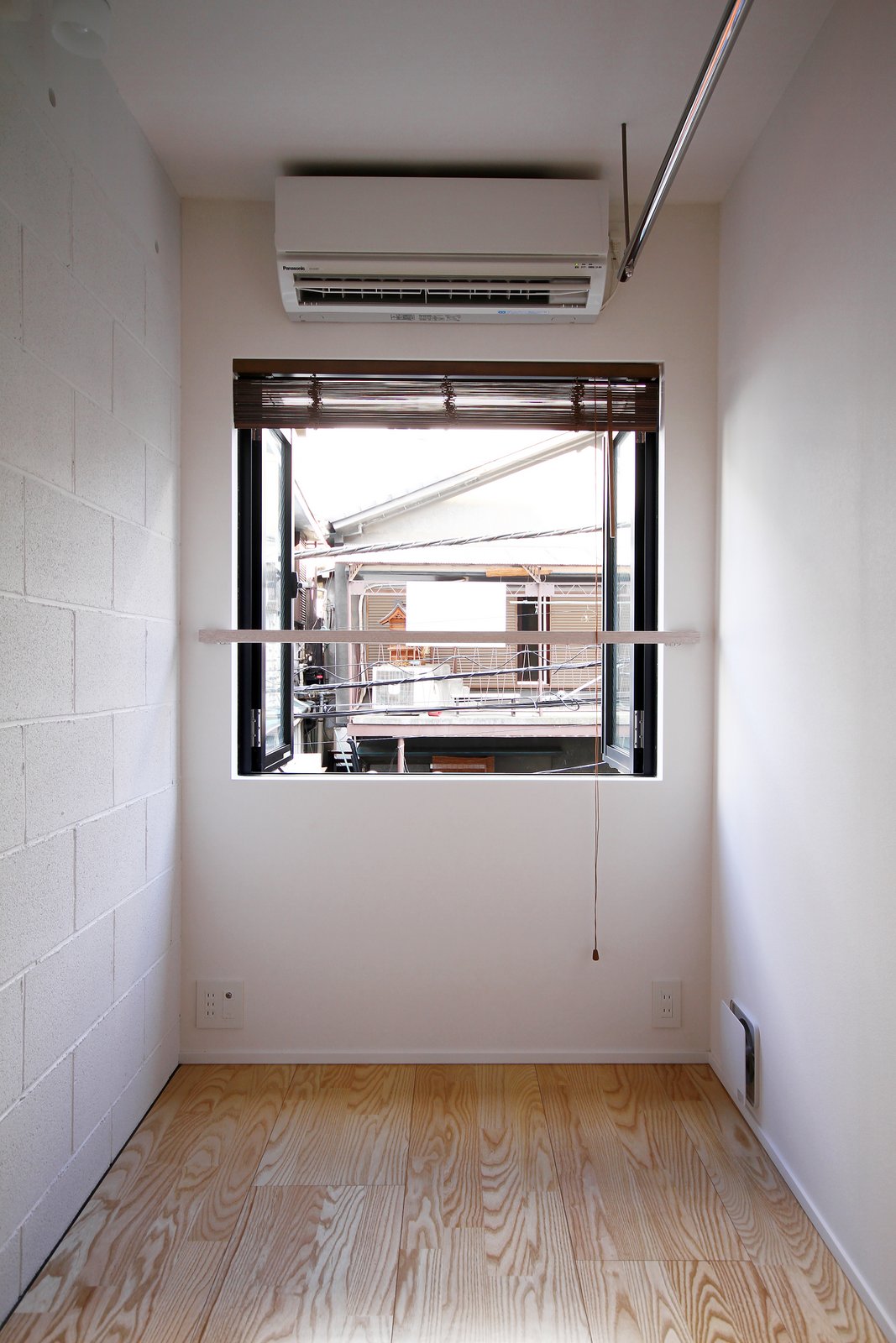 302号室 道路側開口。道路側の開口部は避難のため両開き窓。ダイレクトに外部とつながる。左の壁はコンクリートブロックの住戸間仕切り。将来の拡張に備えている。