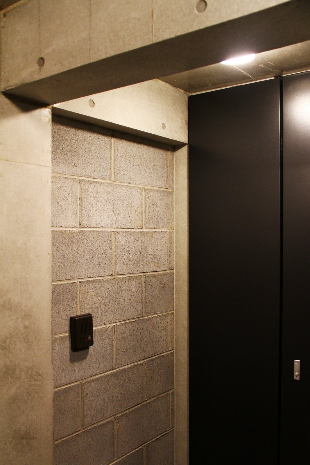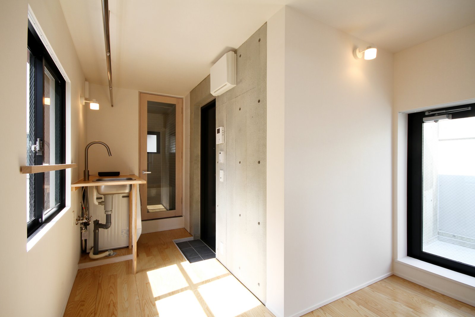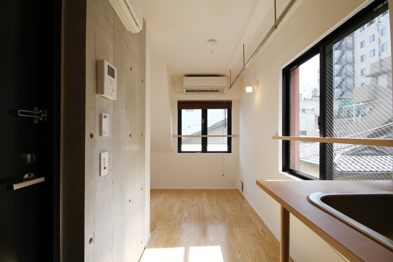 302号室 道路側開口。道路側の開口部は避難のため両開き窓。ダイレクトに外部とつながる。左の壁はコンクリートブロックの住戸間仕切り。将来の拡張に備えている。