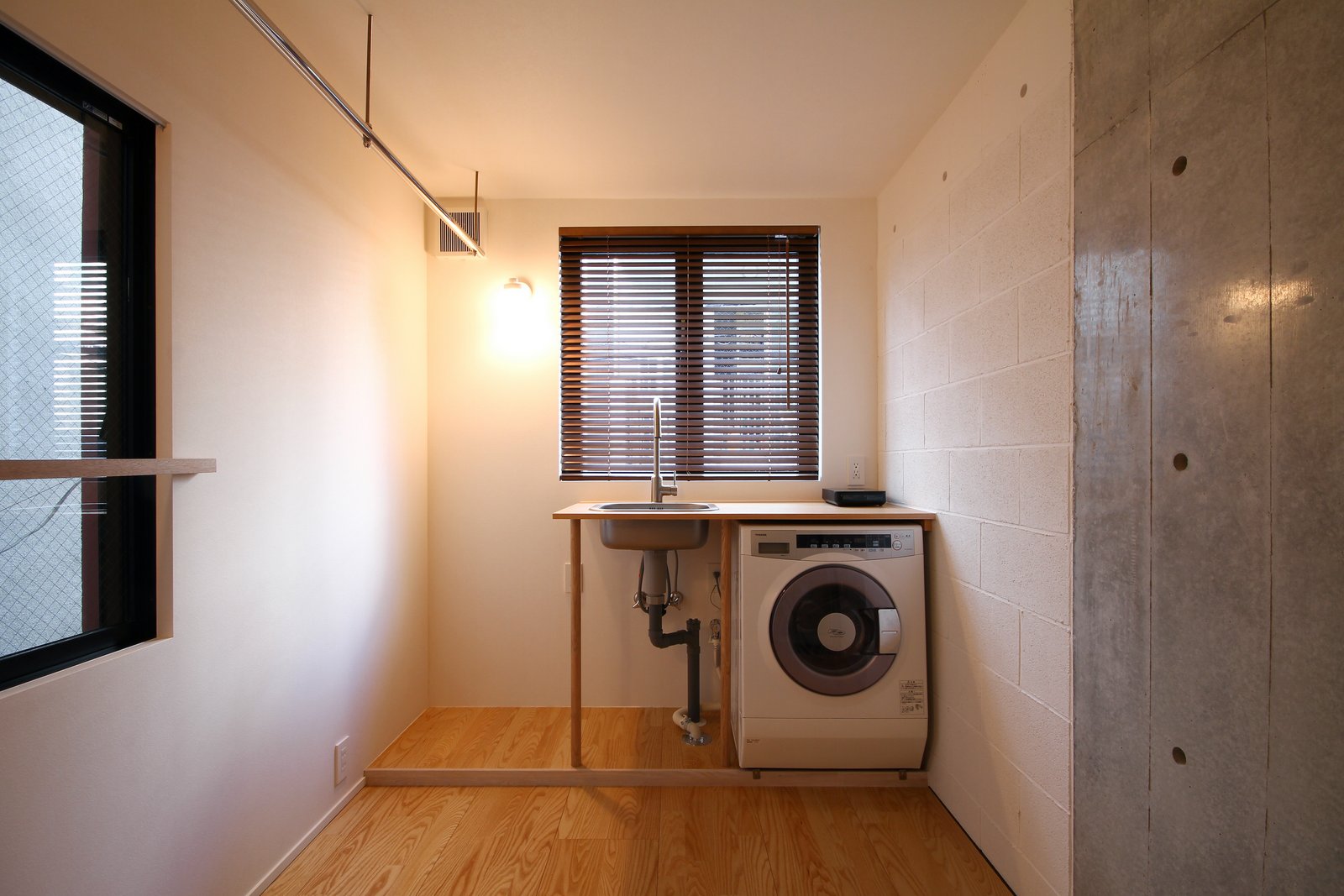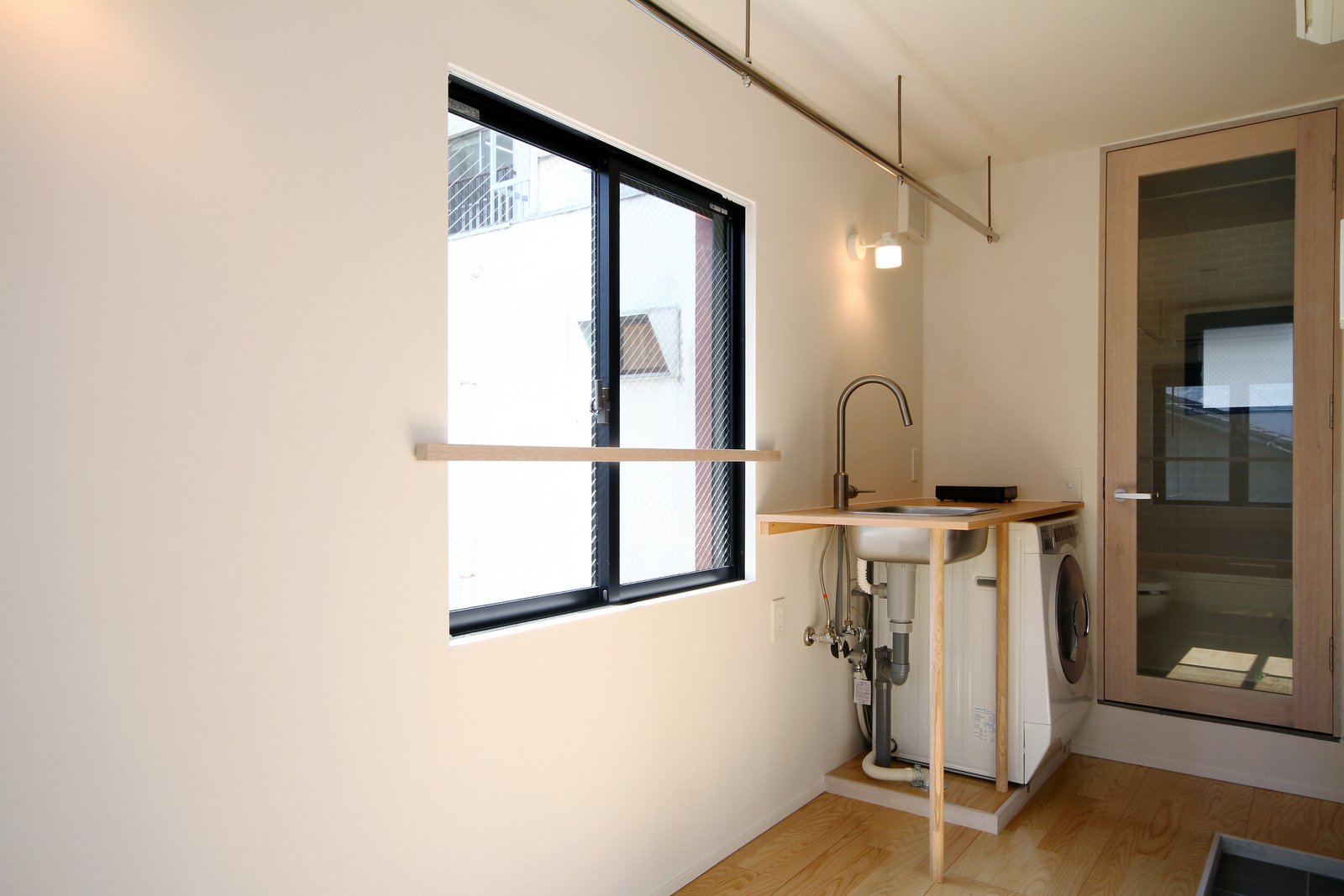 同室 居室 収納の代わりにステンレスパイプが設けられている。